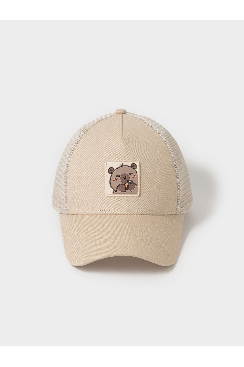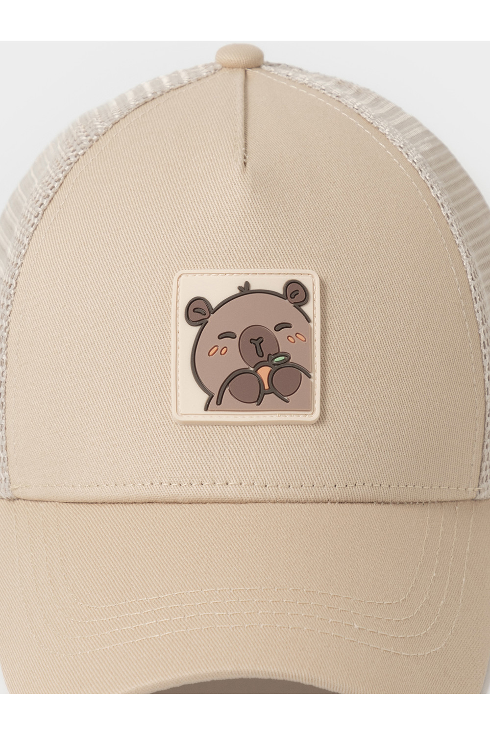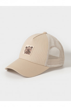 Кепка для девочки из текстиля и сетки. Спереди украшена оригинальной нашивкой. Регулируется по ширине головы и фиксируется на затылке с помощью пластиковой застёжки.