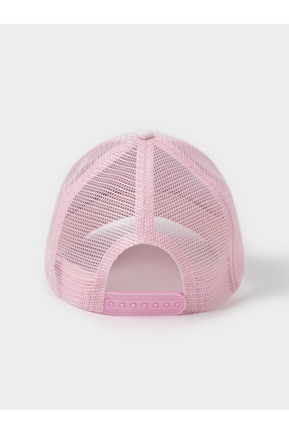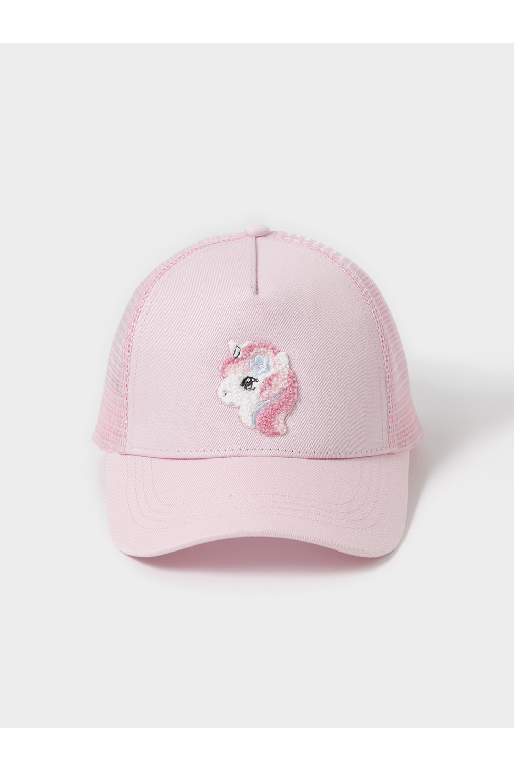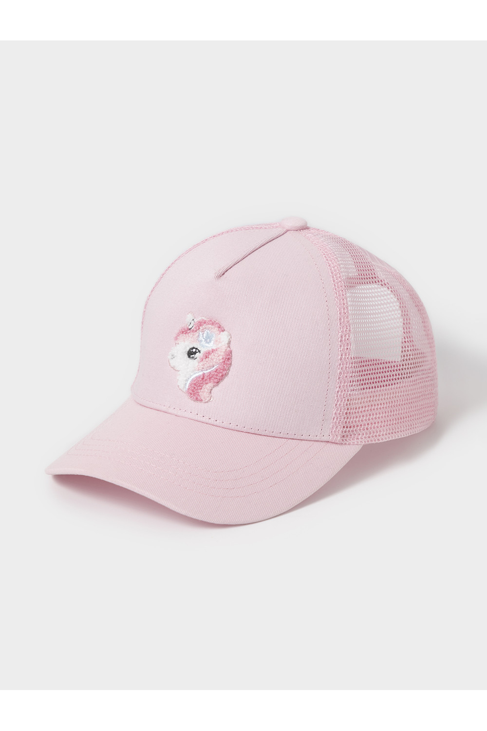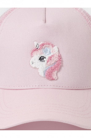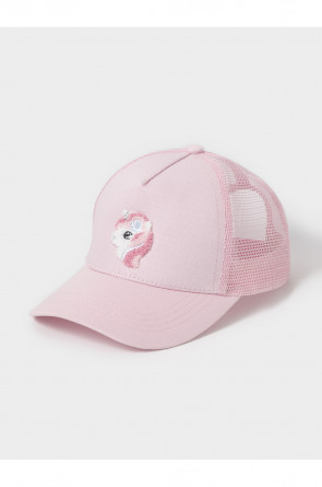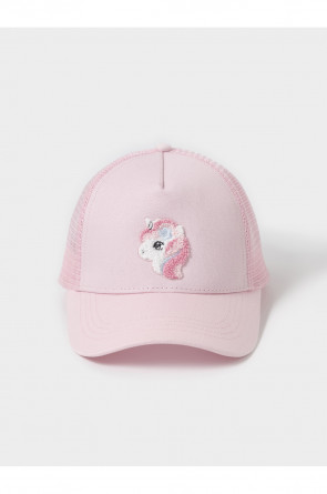 Кепка для девочки из текстиля и сетки. Спереди украшена оригинальной нашивкой. Регулируется по ширине головы и фиксируется на затылке с помощью пластиковой застёжки.