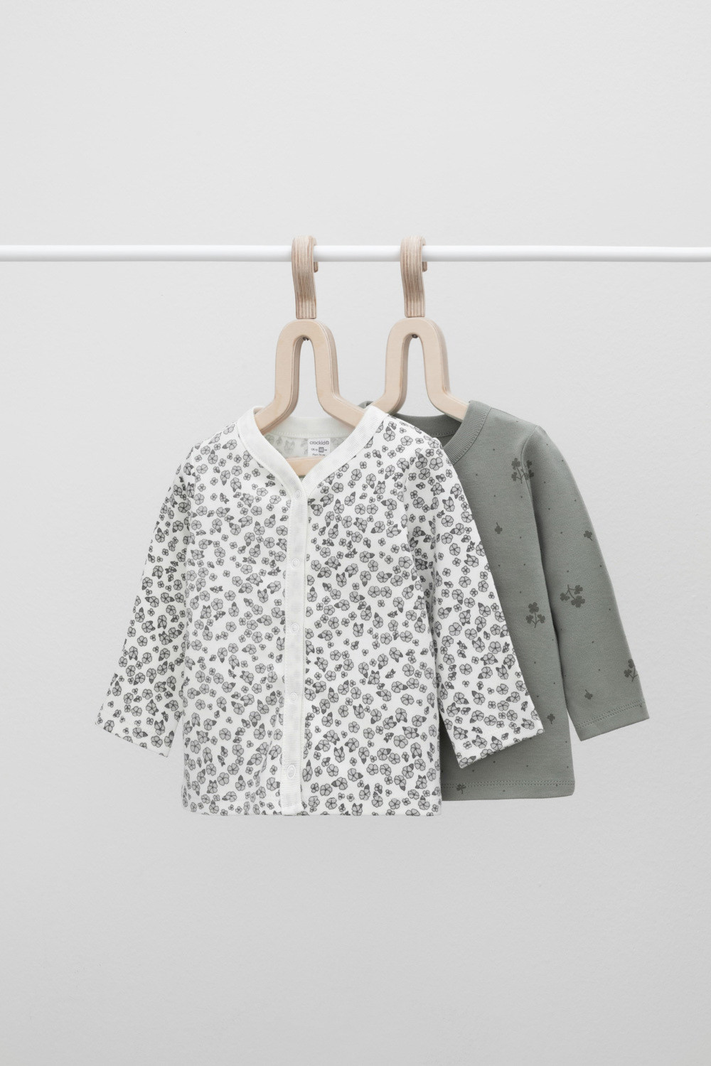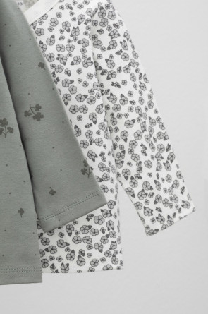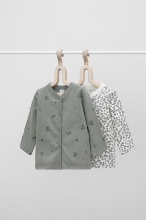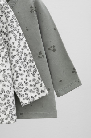 Кофточки в упаковке в количестве 2 штуки для новорожденных из мягкого, эластичного трикотажа, произведенного из натурального хлопка. Изделие застегивается на кнопки. Оригинальная набивка выполнена из стойких, гипоаллергенных текстильных красителей. Все трикотажные полотна производятся в соответсвии с нормами Швейцарского сертификата ЭкоТекс.