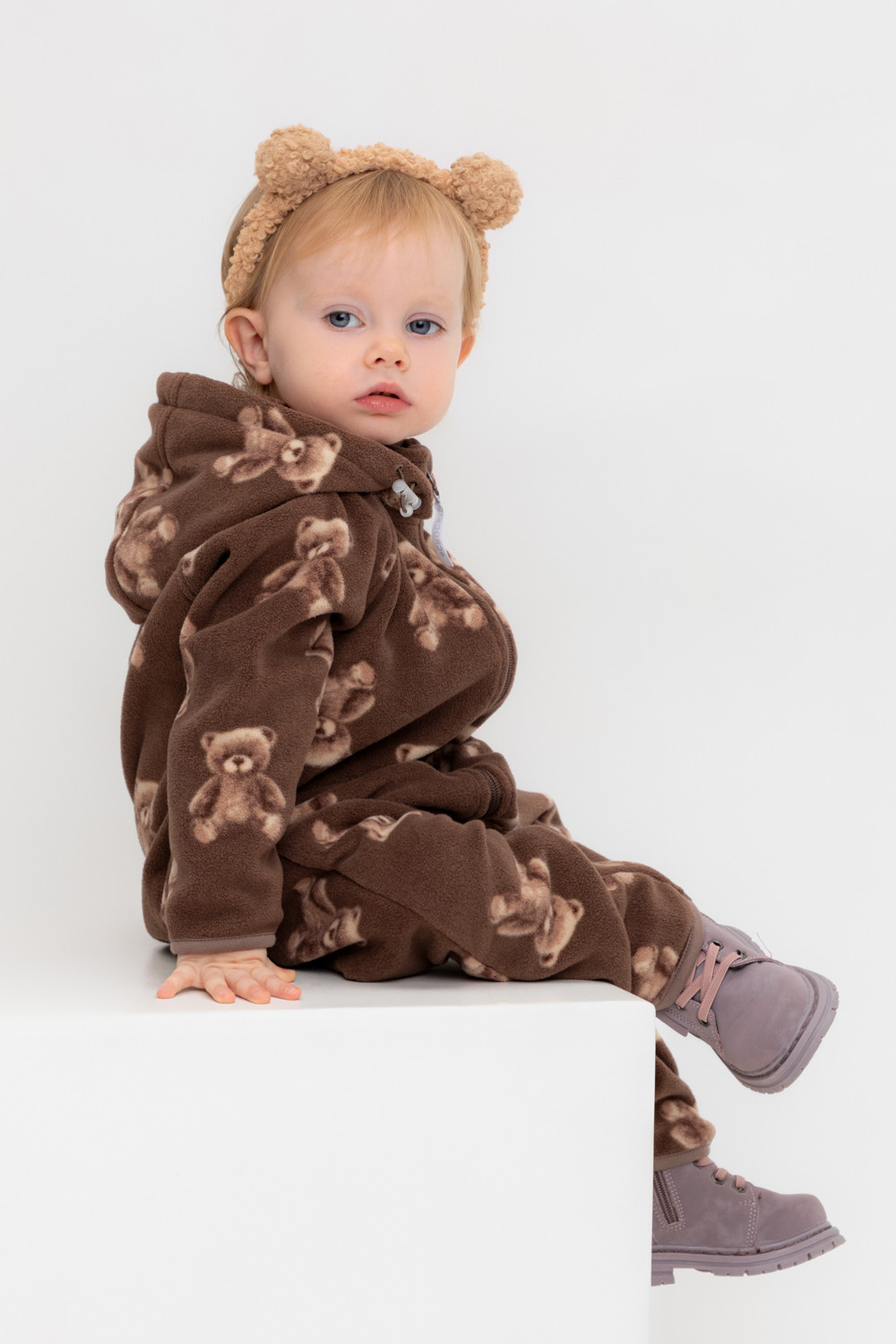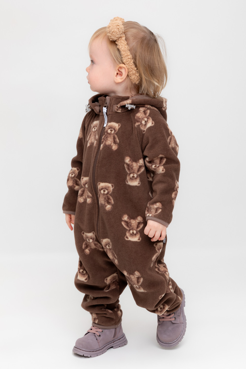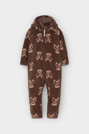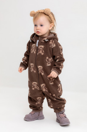 Флисовый комбинезон со съёмным капюшоном для девочки. У изделия высокий воротник и съёмный капюшон на кнопках. Застёгивается на удлинённую молнию. Предусмотрена защита шеи и подбородка. На рукавах и штанинах есть удобные отвороты. Оригинальная набивка выполнена из стойких, гипоаллергенных текстильных красителей. Комбинезон сохраняет цвет и форму после многократных стирок.