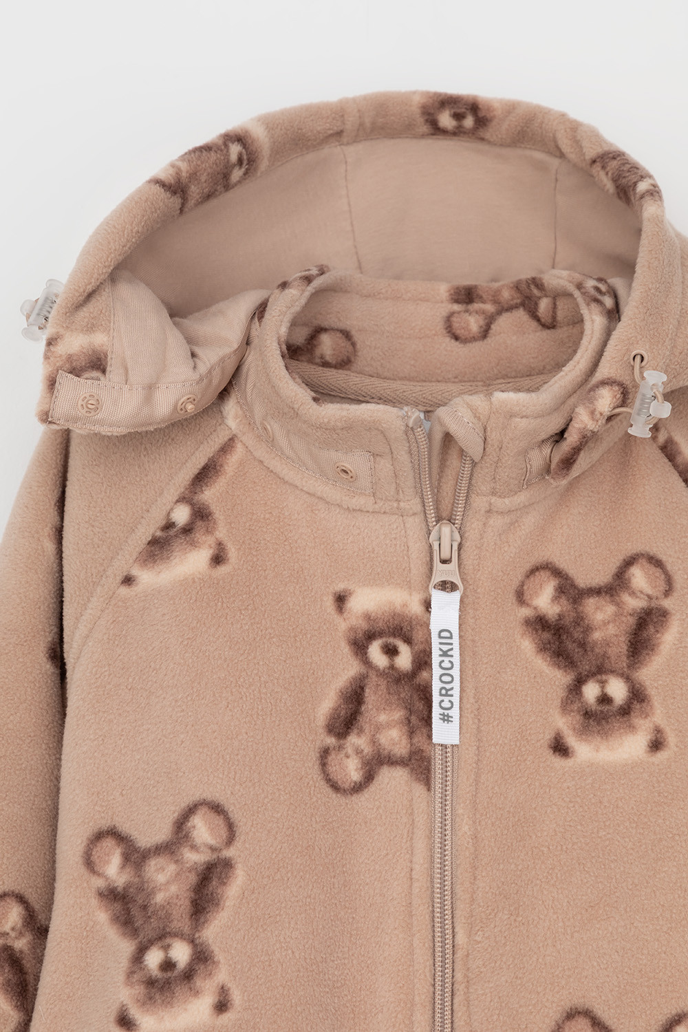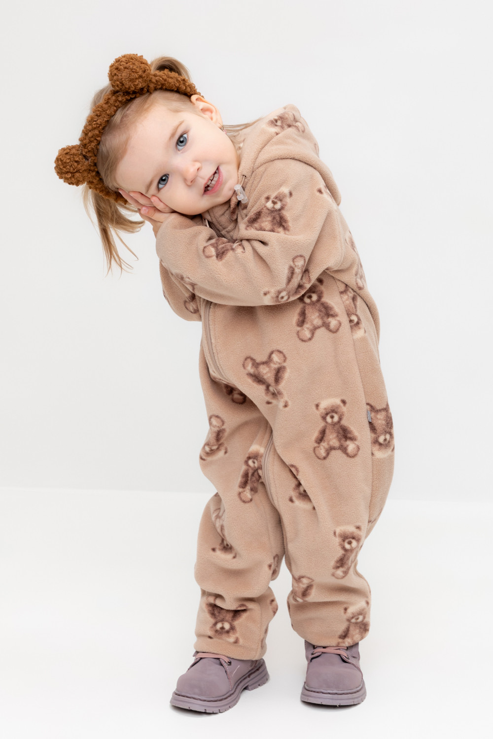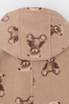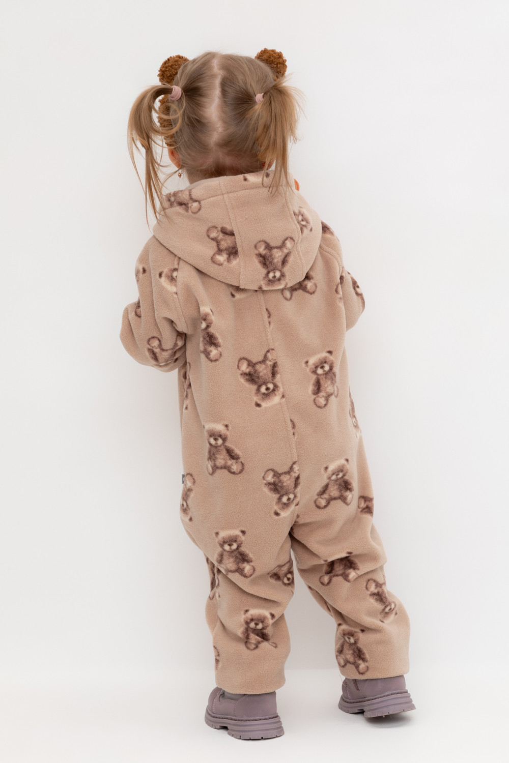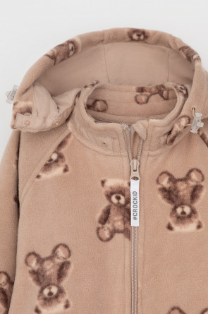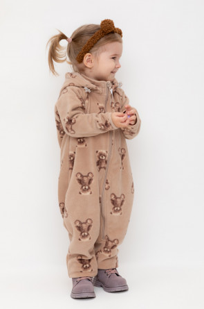 Флисовый комбинезон со съёмным капюшоном для девочки. У изделия высокий воротник и съёмный капюшон на кнопках. Застёгивается на удлинённую молнию. Предусмотрена защита шеи и подбородка. На рукавах и штанинах есть удобные отвороты. Оригинальная набивка выполнена из стойких, гипоаллергенных текстильных красителей. Комбинезон сохраняет цвет и форму после многократных стирок.