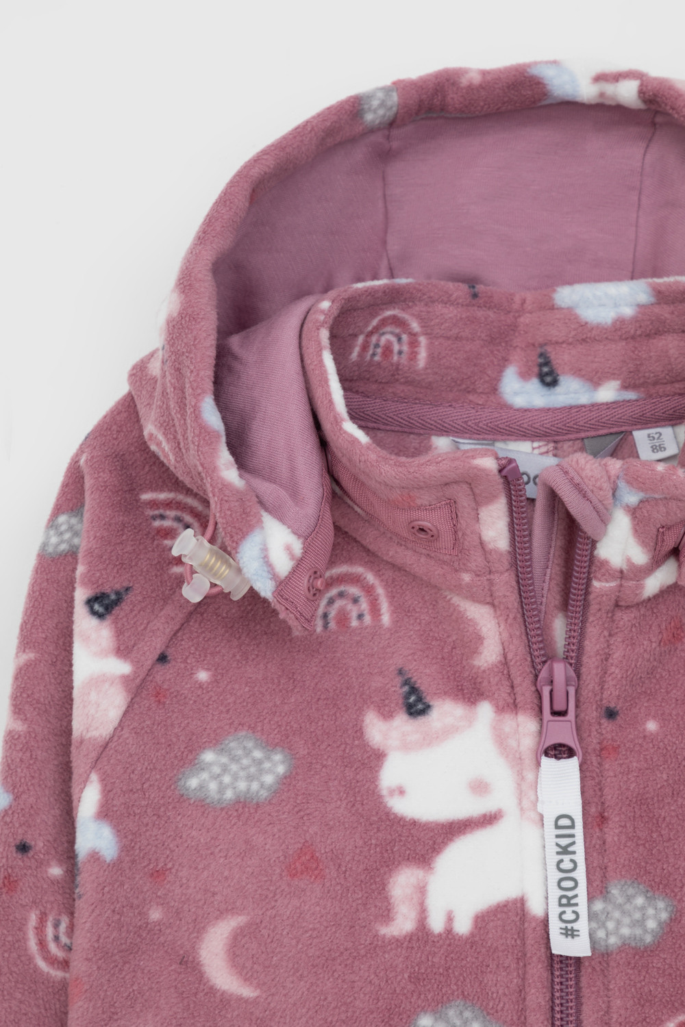 Флисовый комбинезон со съёмным капюшоном для девочки. У изделия высокий воротник и съёмный капюшон на кнопках с подкладом из супрема. Застёгивается на удлинённую молнию. Предусмотрена защита шеи и подбородка. В размерах 40/62 - 48/74 на рукавах и штанинах есть удобные отвороты. Оригинальная набивка выполнена из стойких, гипоаллергенных текстильных красителей. Комбинезон сохраняет цвет и форму после многократных стирок.