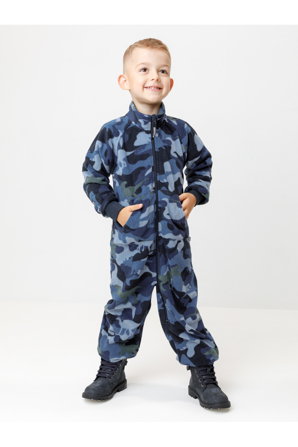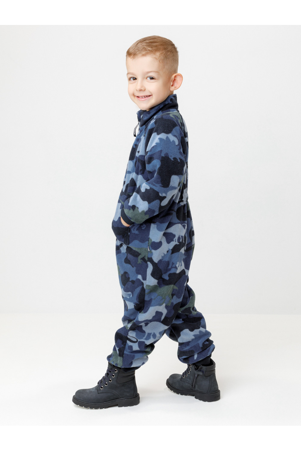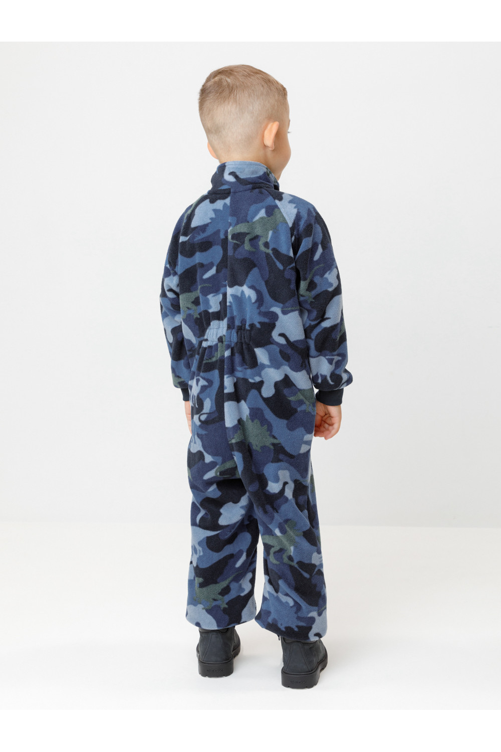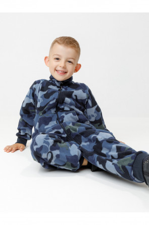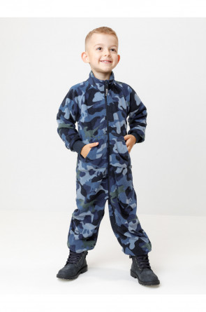 Флисовый комбинезон для мальчика с высоким воротником. Застёгивается на удлинённую молнию с мягкой защитой шеи и подбородка. Рукава и низ изделия на манжетах из трикотажа в рубчик. Эластичная резинка по спинке обеспечивает идеальную посадку. Спереди удобный карман-кенгуру. Оригинальная набивка выполнена из стойких гипоаллергенных текстильных красителей. Комбинезон сохраняет цвет и форму после многократных стирок.