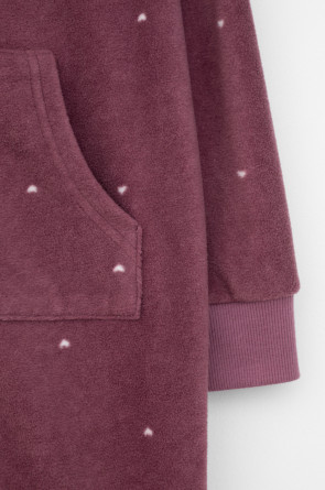 Флисовый комбинезон для девочки. У изделия высокий воротник и рукава-реглан. Застёгивается на удлинённую молнию. Предусмотрена защита шеи и подбородка. Спереди карман-кенгуру. Оригинальная набивка выполнена из стойких, гипоаллергенных текстильных красителей. Комбинезон сохраняет цвет и форму после многократных стирок.