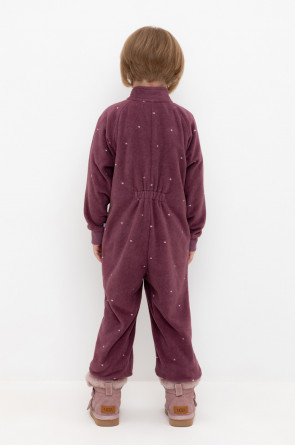 Флисовый комбинезон для девочки. У изделия высокий воротник и рукава-реглан. Застёгивается на удлинённую молнию. Предусмотрена защита шеи и подбородка. Спереди карман-кенгуру. Оригинальная набивка выполнена из стойких, гипоаллергенных текстильных красителей. Комбинезон сохраняет цвет и форму после многократных стирок.
