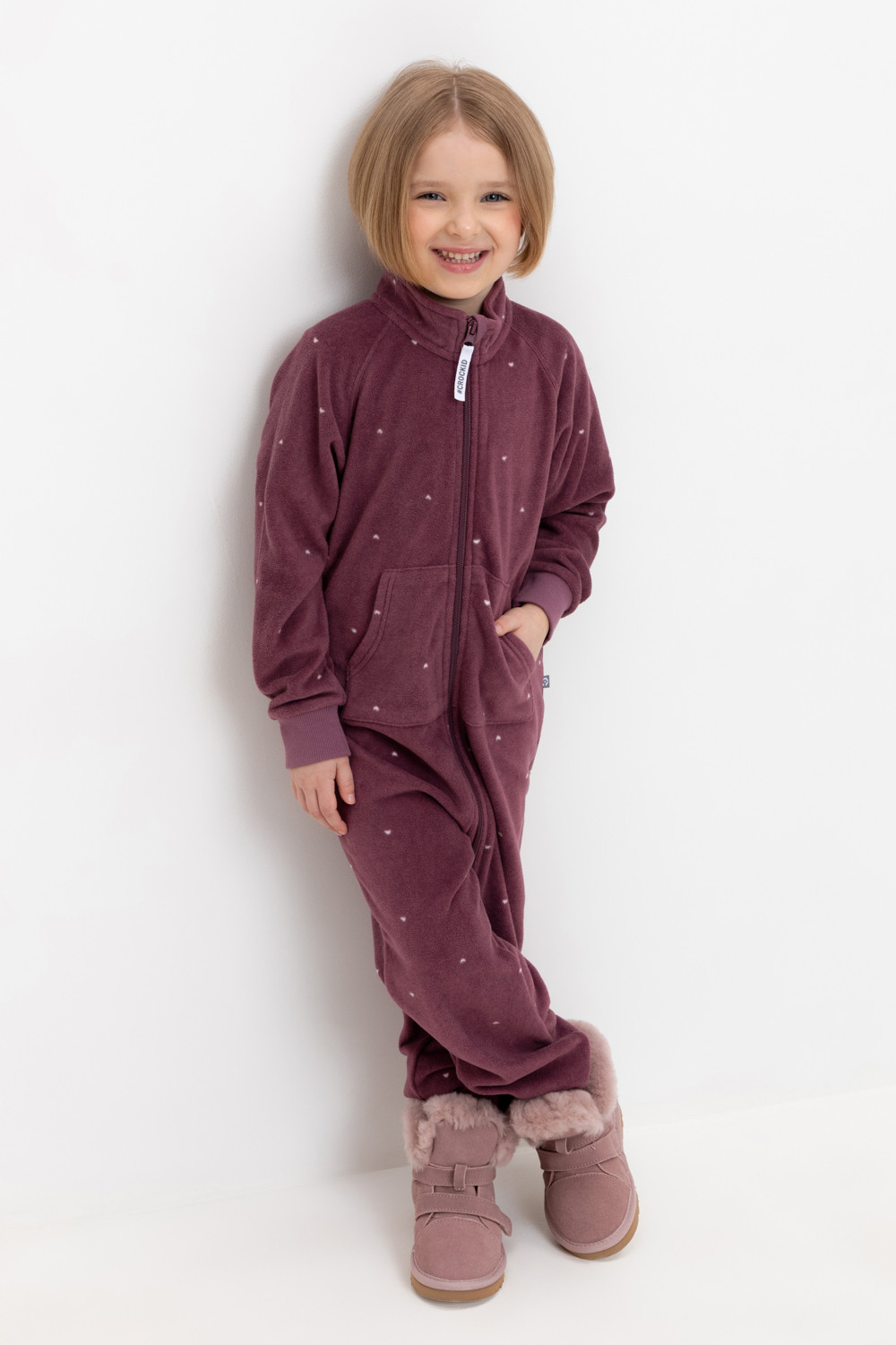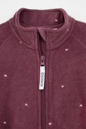 Флисовый комбинезон для девочки. У изделия высокий воротник и рукава-реглан. Застёгивается на удлинённую молнию. Предусмотрена защита шеи и подбородка. Спереди карман-кенгуру. Оригинальная набивка выполнена из стойких, гипоаллергенных текстильных красителей. Комбинезон сохраняет цвет и форму после многократных стирок.