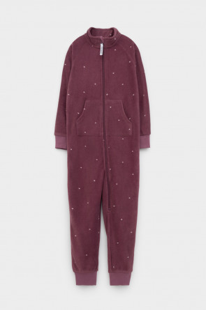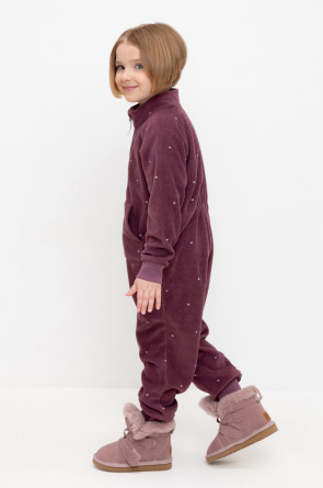 Флисовый комбинезон для девочки. У изделия высокий воротник и рукава-реглан. Застёгивается на удлинённую молнию. Предусмотрена защита шеи и подбородка. Спереди карман-кенгуру. Оригинальная набивка выполнена из стойких, гипоаллергенных текстильных красителей. Комбинезон сохраняет цвет и форму после многократных стирок.