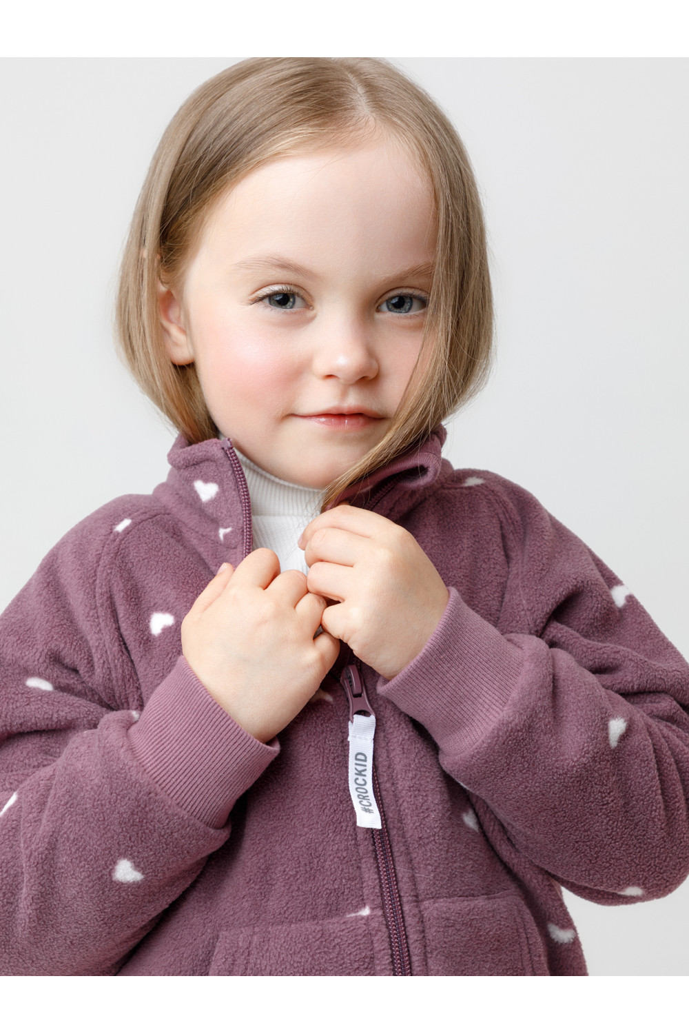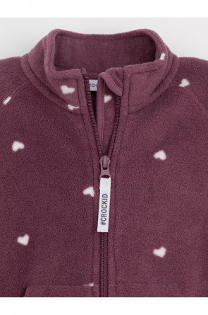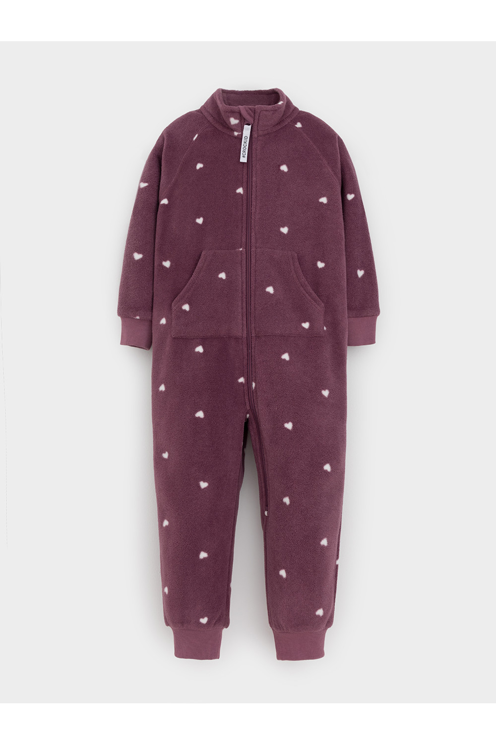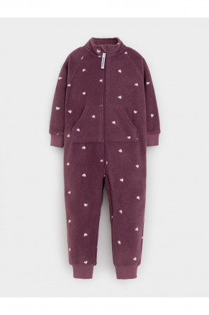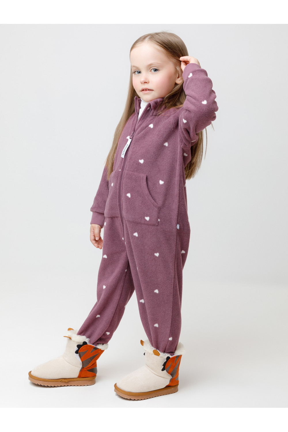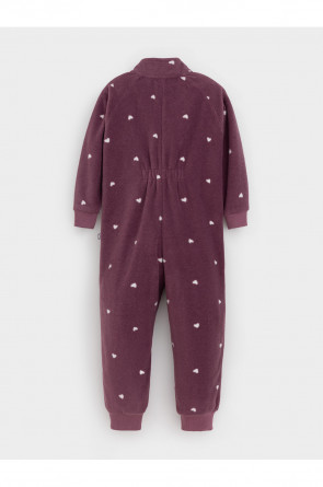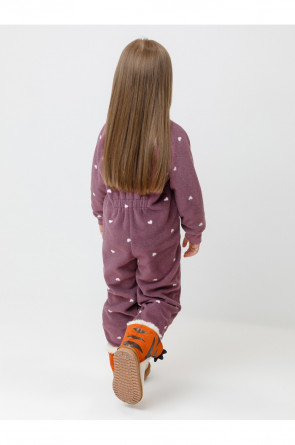 Флисовый комбинезон для девочки с высоким воротником. Застёгивается на удлинённую молнию с мягкой защитой шеи и подбородка. Рукава и низ изделия на манжетах из трикотажа в рубчик. Эластичная резинка по спинке обеспечивает идеальную посадку. Спереди удобный карман-кенгуру. Оригинальная набивка выполнена из стойких гипоаллергенных текстильных красителей. Комбинезон сохраняет цвет и форму после многократных стирок.