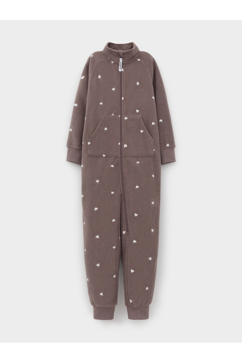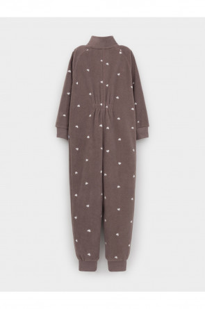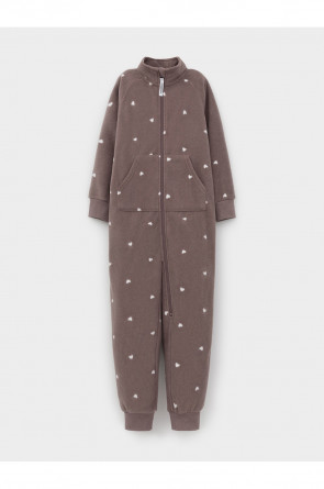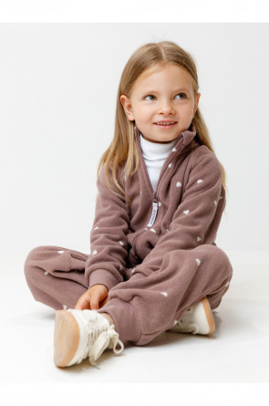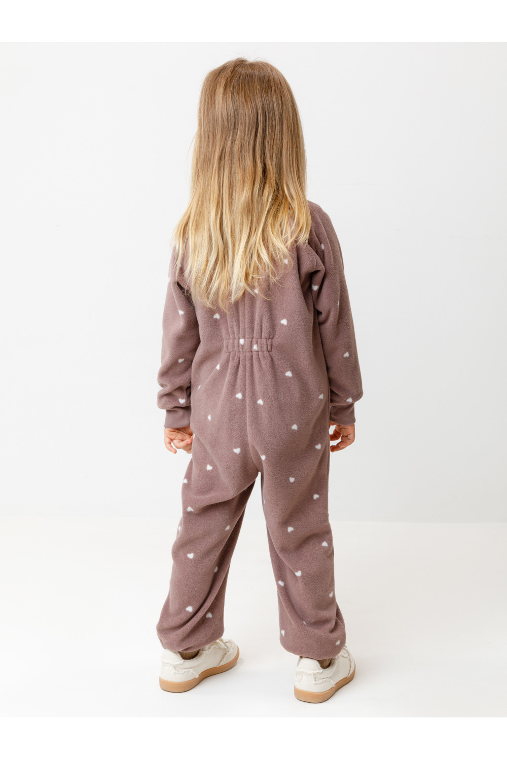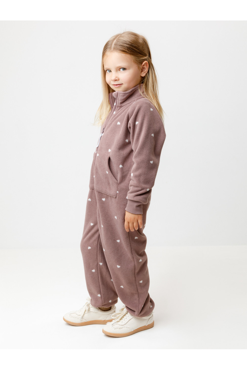 Флисовый комбинезон для девочки с высоким воротником. Застёгивается на удлинённую молнию с мягкой защитой шеи и подбородка. Рукава и низ изделия на манжетах из трикотажа в рубчик. Эластичная резинка по спинке обеспечивает идеальную посадку. Спереди удобный карман-кенгуру. Оригинальная набивка выполнена из стойких гипоаллергенных текстильных красителей. Комбинезон сохраняет цвет и форму после многократных стирок.