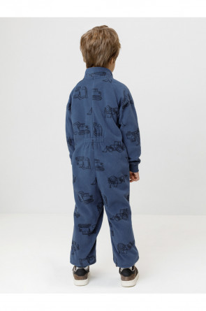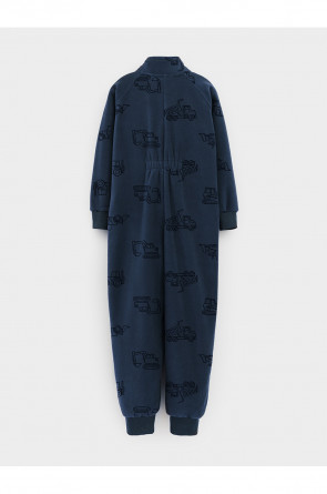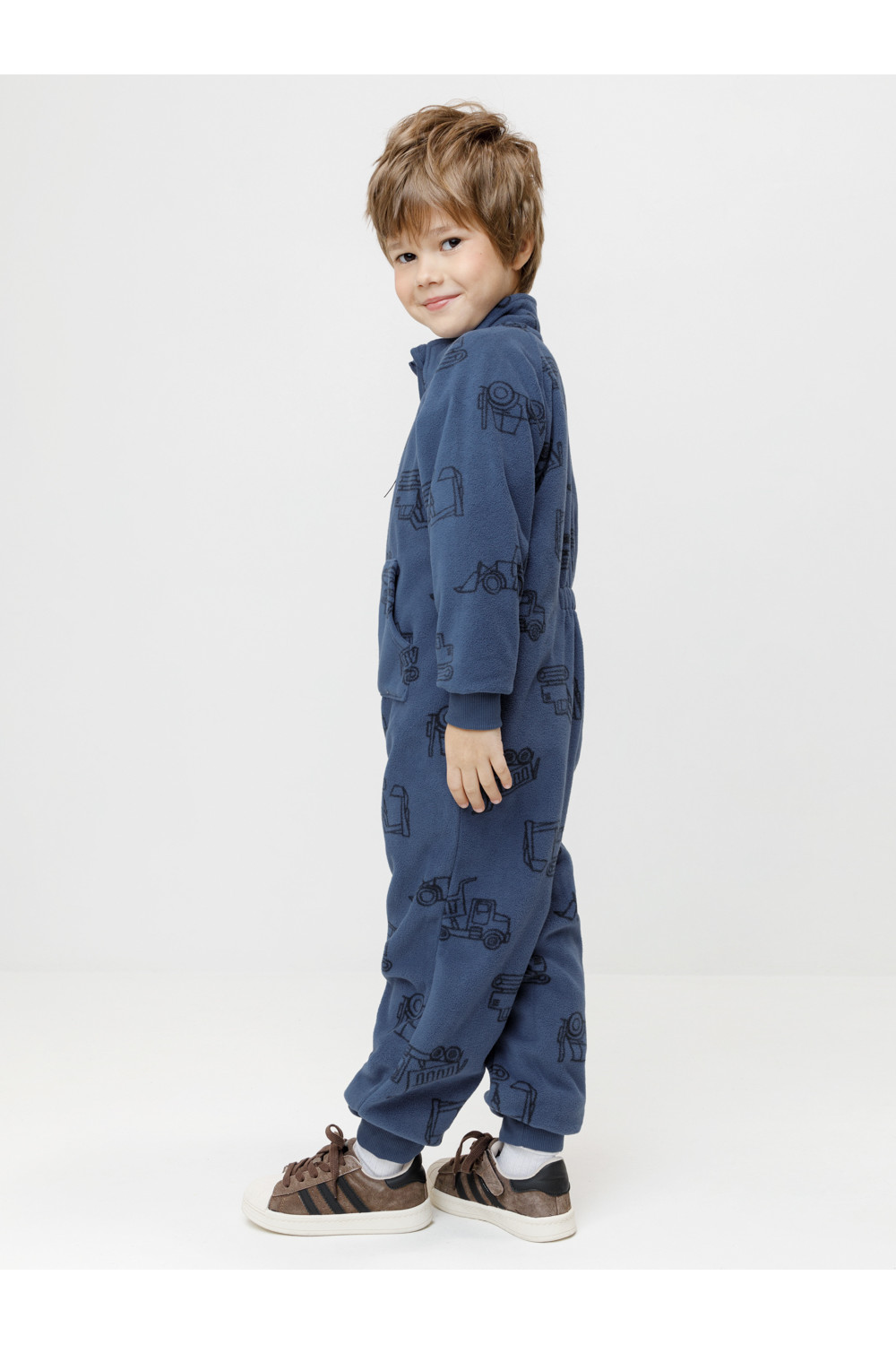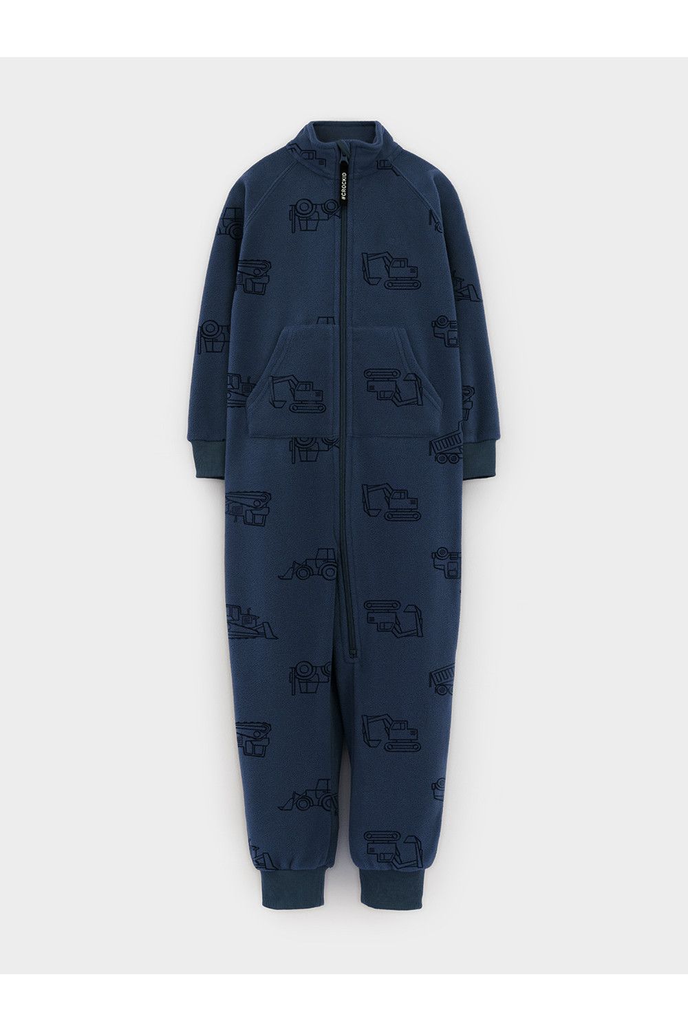 Флисовый комбинезон для мальчика с высоким воротником. Застёгивается на удлинённую молнию с мягкой защитой шеи и подбородка. Рукава и низ изделия на манжетах из трикотажа в рубчик. Эластичная резинка по спинке обеспечивает идеальную посадку. Спереди удобный карман-кенгуру. Оригинальная набивка выполнена из стойких гипоаллергенных текстильных красителей. Комбинезон сохраняет цвет и форму после многократных стирок.