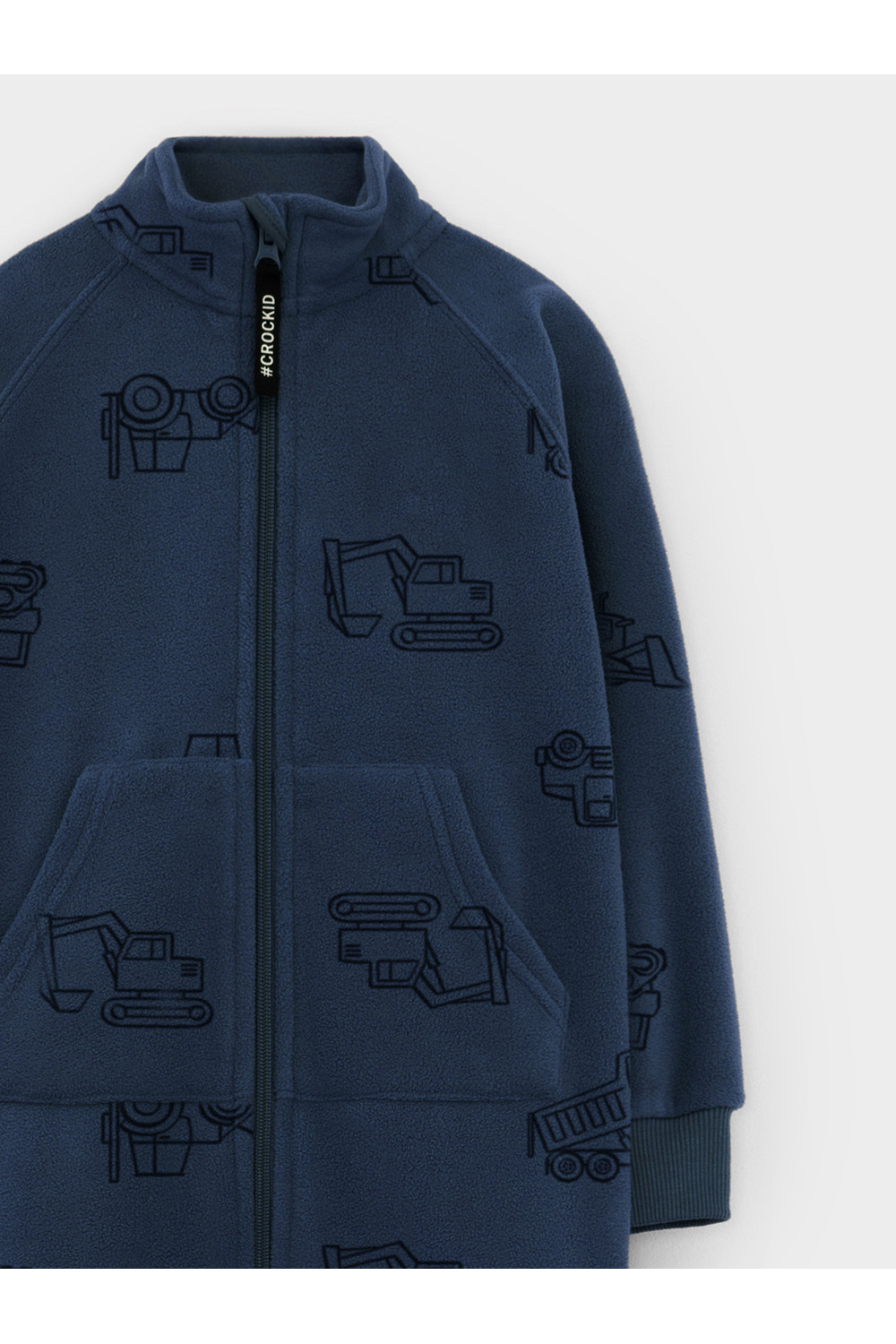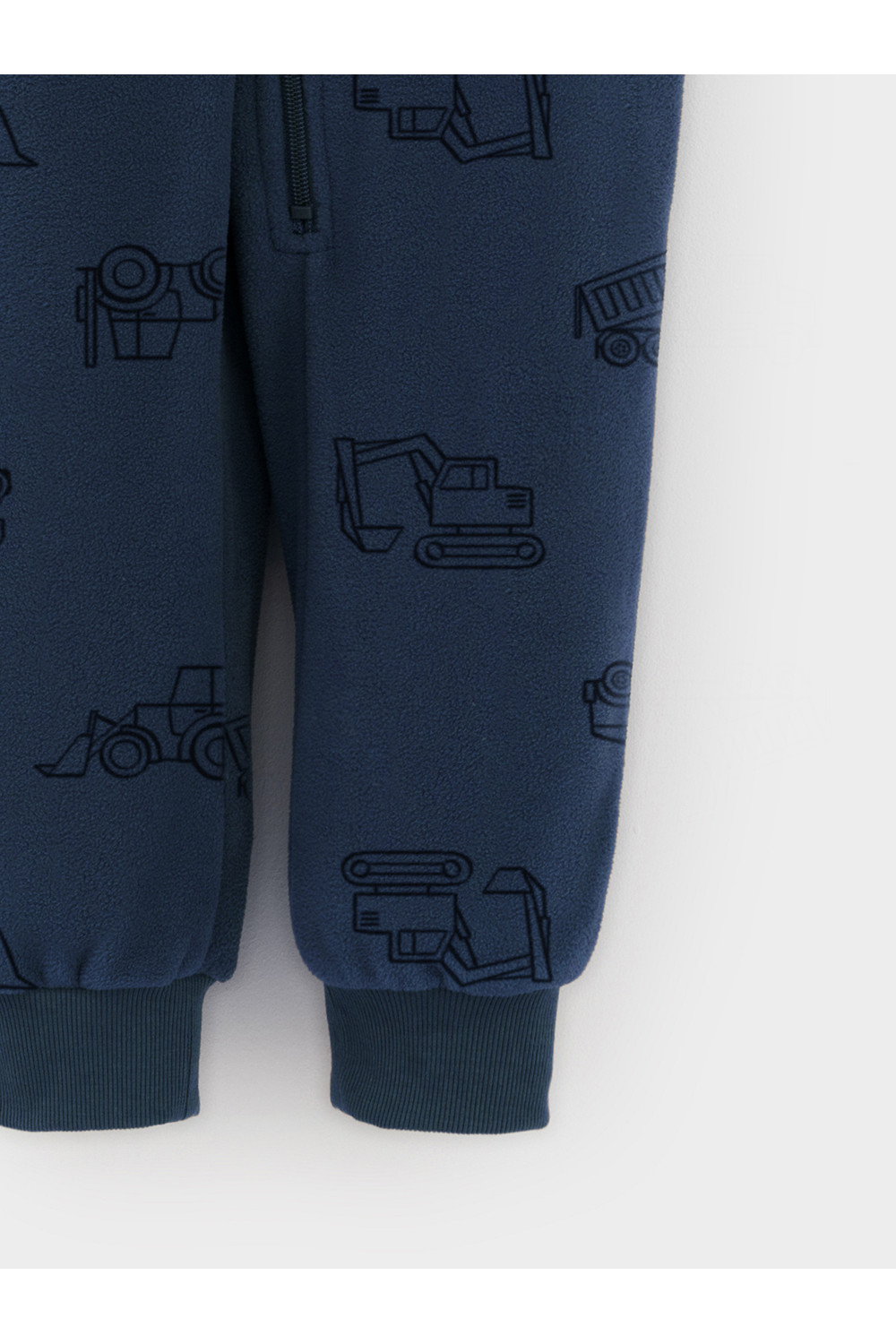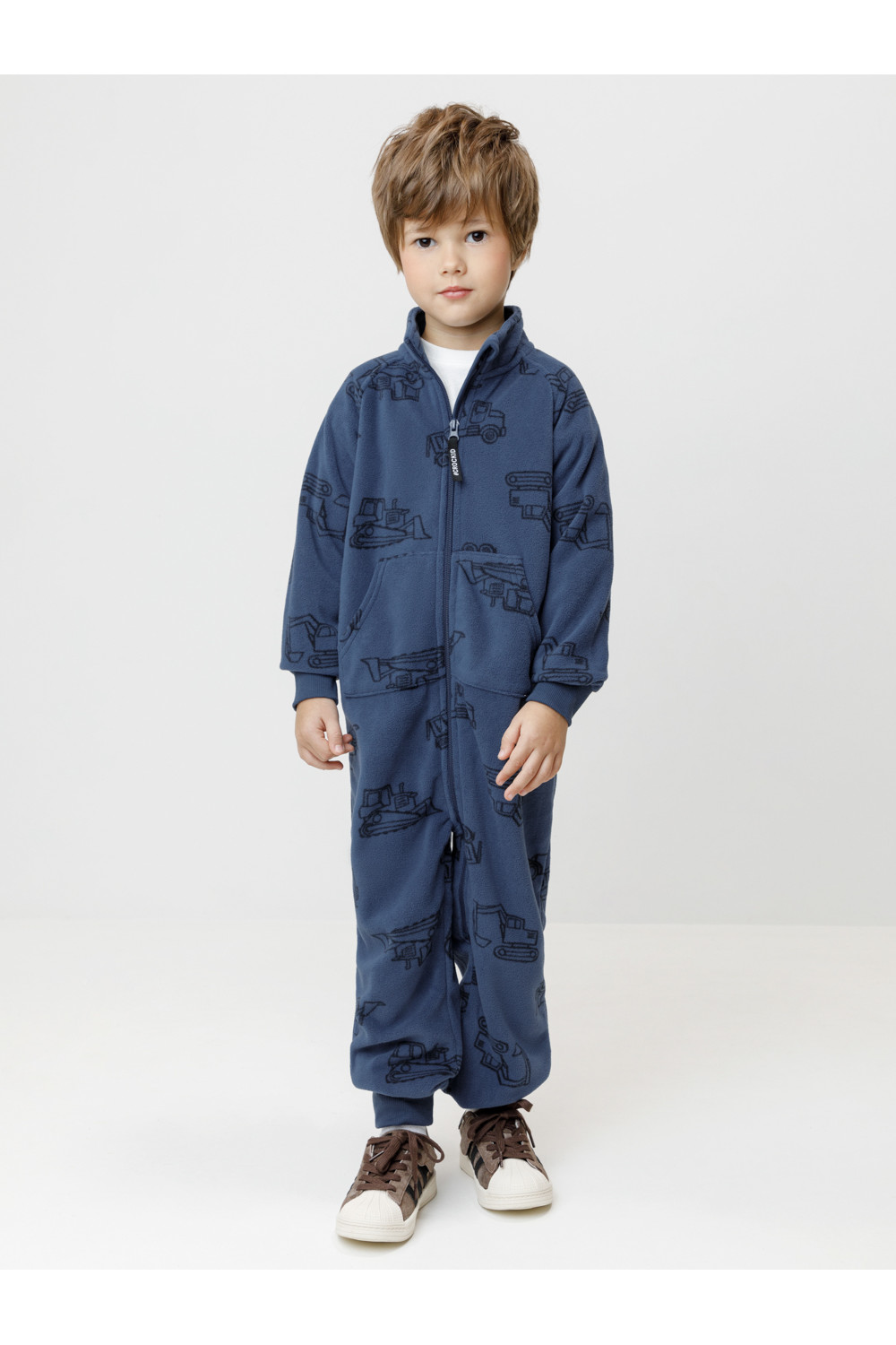 Флисовый комбинезон для мальчика с высоким воротником. Застёгивается на удлинённую молнию с мягкой защитой шеи и подбородка. Рукава и низ изделия на манжетах из трикотажа в рубчик. Эластичная резинка по спинке обеспечивает идеальную посадку. Спереди удобный карман-кенгуру. Оригинальная набивка выполнена из стойких гипоаллергенных текстильных красителей. Комбинезон сохраняет цвет и форму после многократных стирок.