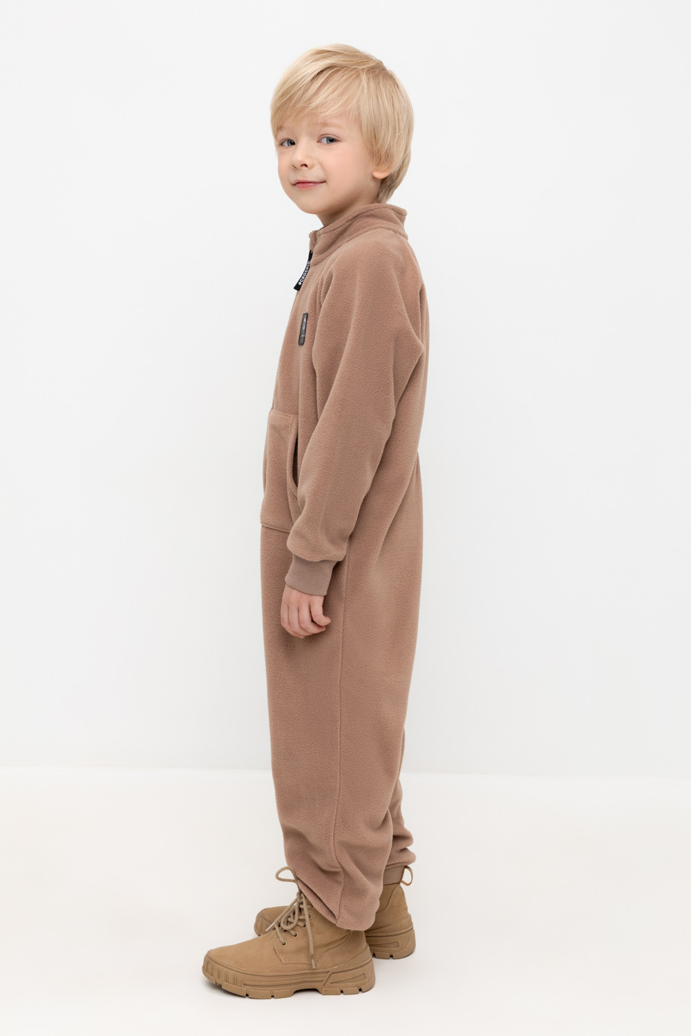 Флисовый комбинезон для мальчика. У изделия высокий воротник и рукава-реглан. Застёгивается на удлинённую молнию. Предусмотрена защита шеи и подбородка. Спереди карман-кенгуру. Комбинезон сохраняет цвет и форму после многократных стирок.