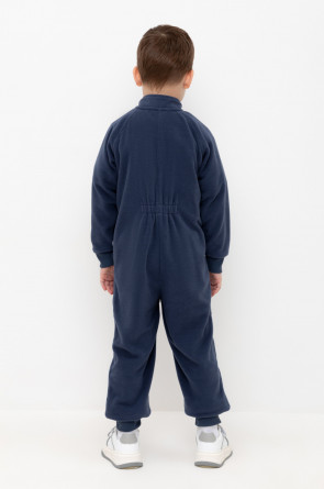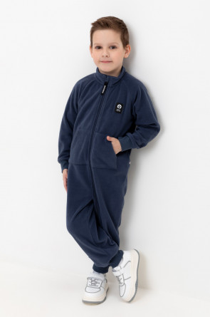 Флисовый комбинезон для мальчика. У изделия высокий воротник и рукава-реглан. Застёгивается на удлинённую молнию. Предусмотрена защита шеи и подбородка. Спереди карман-кенгуру. Комбинезон сохраняет цвет и форму после многократных стирок.