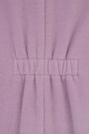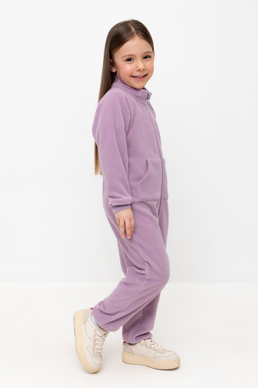 Флисовый комбинезон для девочки. У изделия высокий воротник и рукава-реглан. Застёгивается на удлинённую молнию. Предусмотрена защита шеи и подбородка. Спереди карман-кенгуру. Комбинезон сохраняет цвет и форму после многократных стирок.