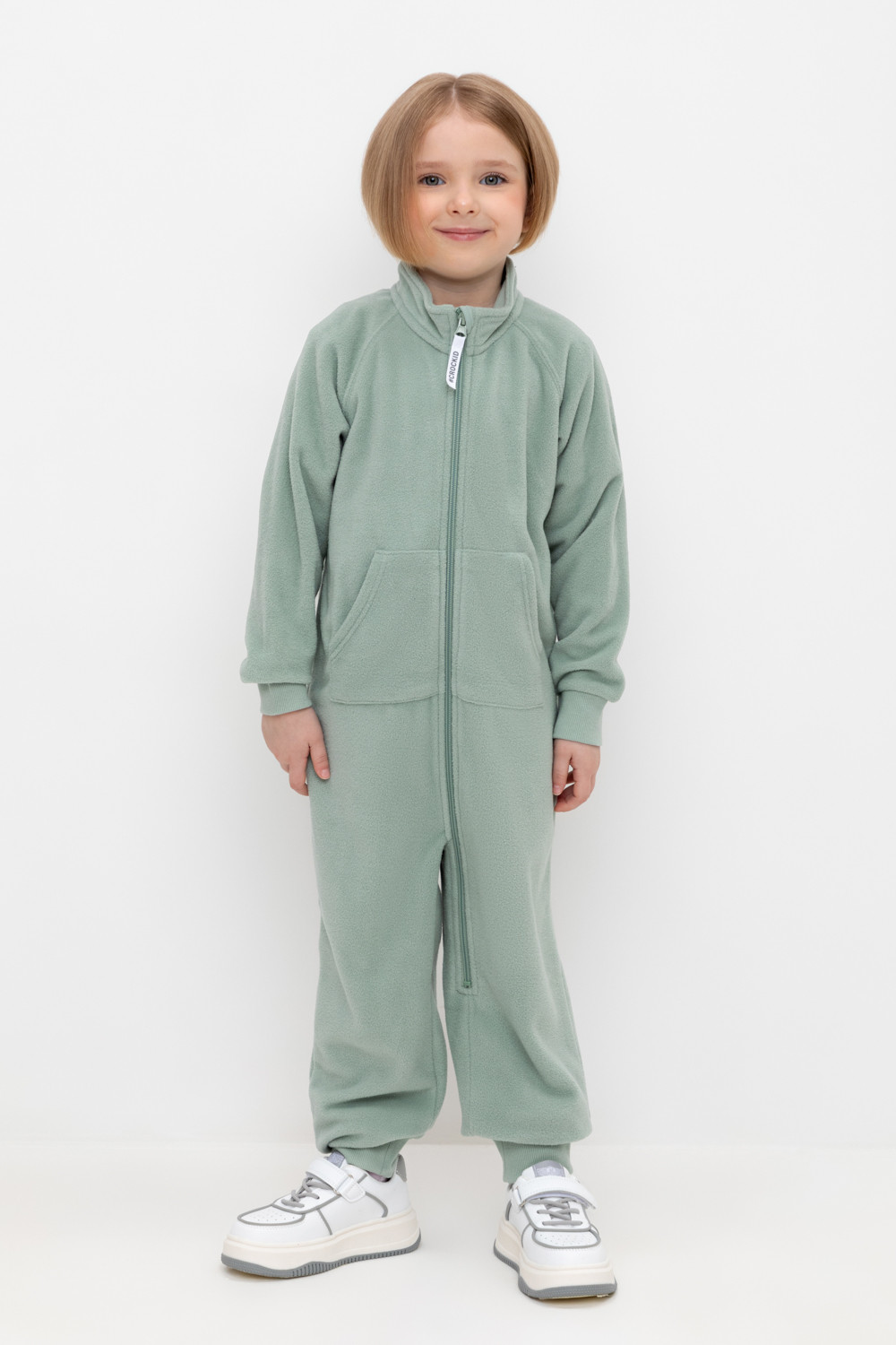 Флисовый комбинезон для девочки. У изделия высокий воротник и рукава-реглан. Застёгивается на удлинённую молнию. Предусмотрена защита шеи и подбородка. Спереди карман-кенгуру. Комбинезон сохраняет цвет и форму после многократных стирок.