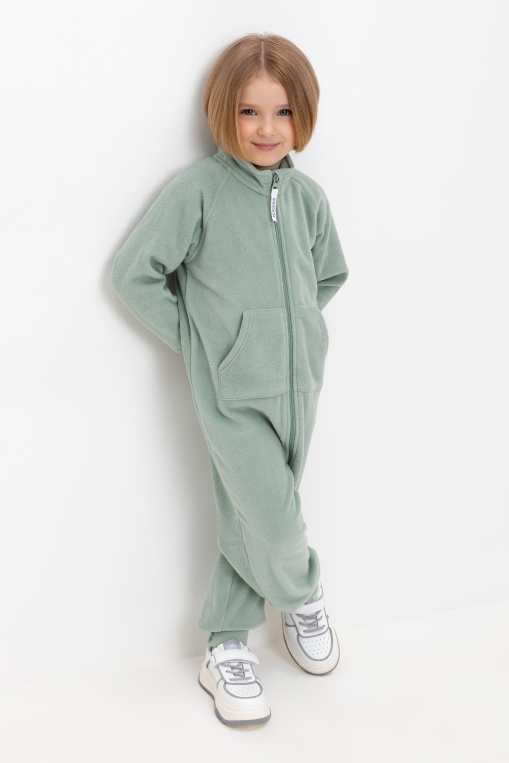 Флисовый комбинезон для девочки. У изделия высокий воротник и рукава-реглан. Застёгивается на удлинённую молнию. Предусмотрена защита шеи и подбородка. Спереди карман-кенгуру. Комбинезон сохраняет цвет и форму после многократных стирок.