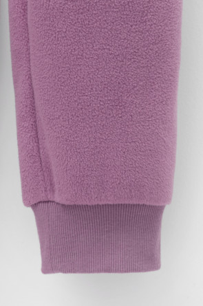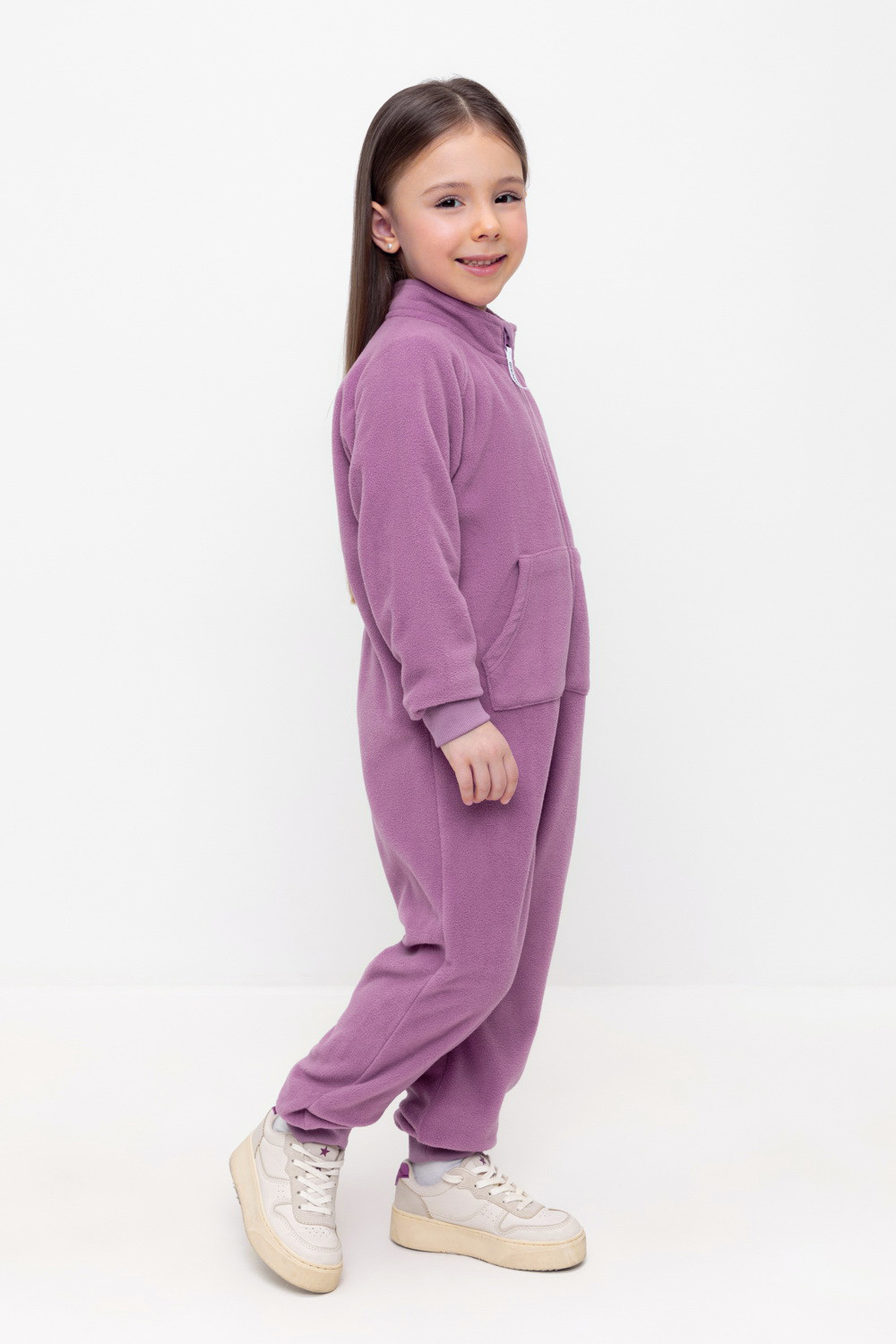 Флисовый комбинезон для девочки. У изделия высокий воротник и рукава-реглан. Застёгивается на удлинённую молнию. Предусмотрена защита шеи и подбородка. Спереди карман-кенгуру. Комбинезон сохраняет цвет и форму после многократных стирок.