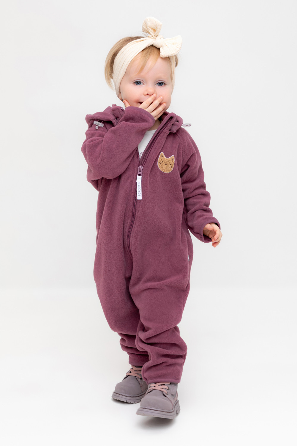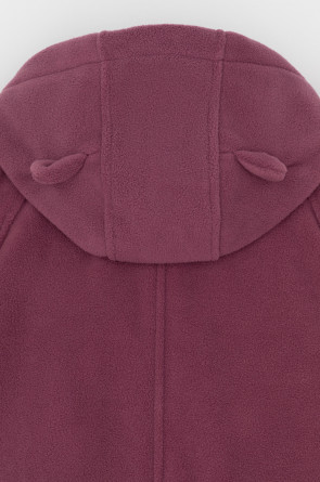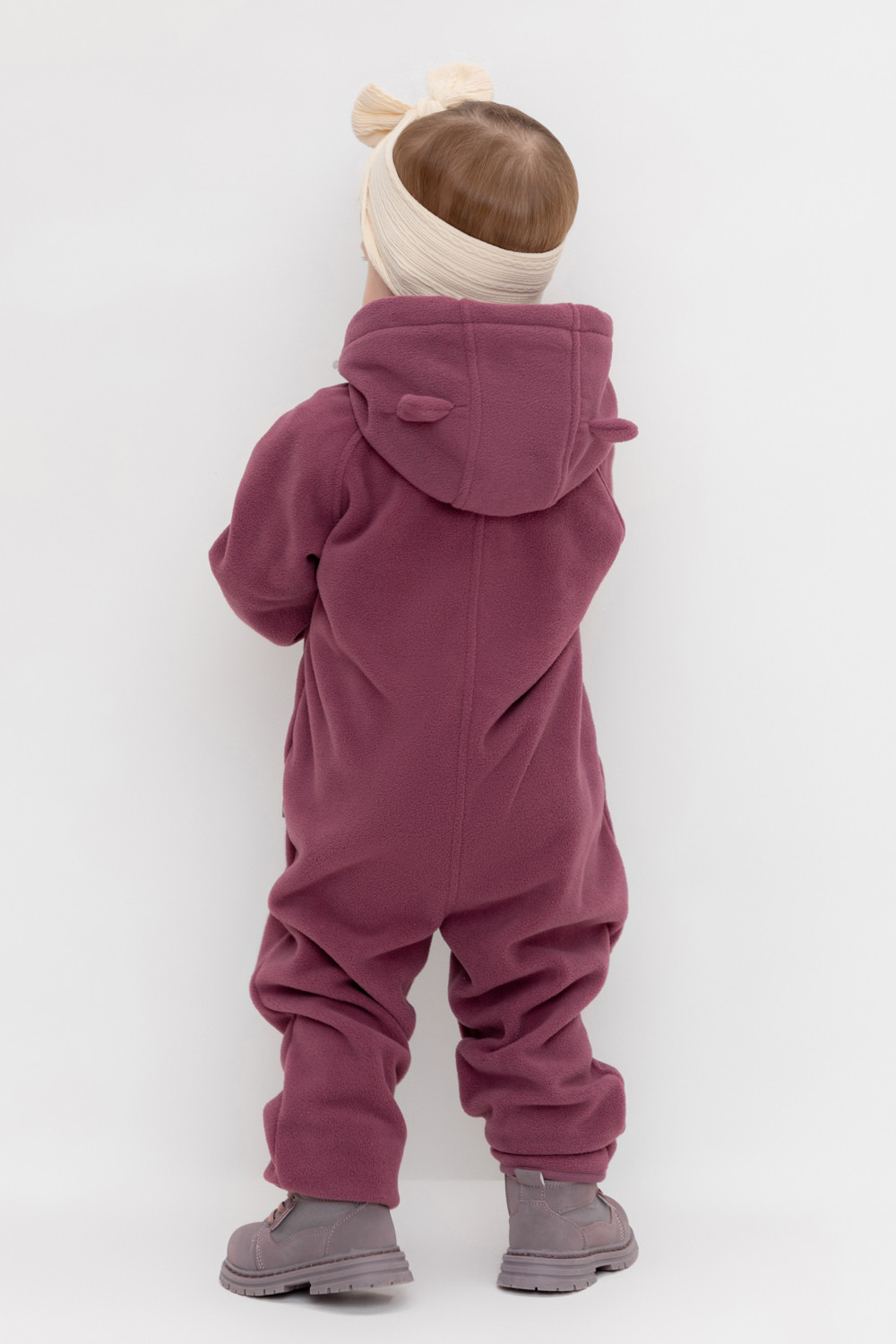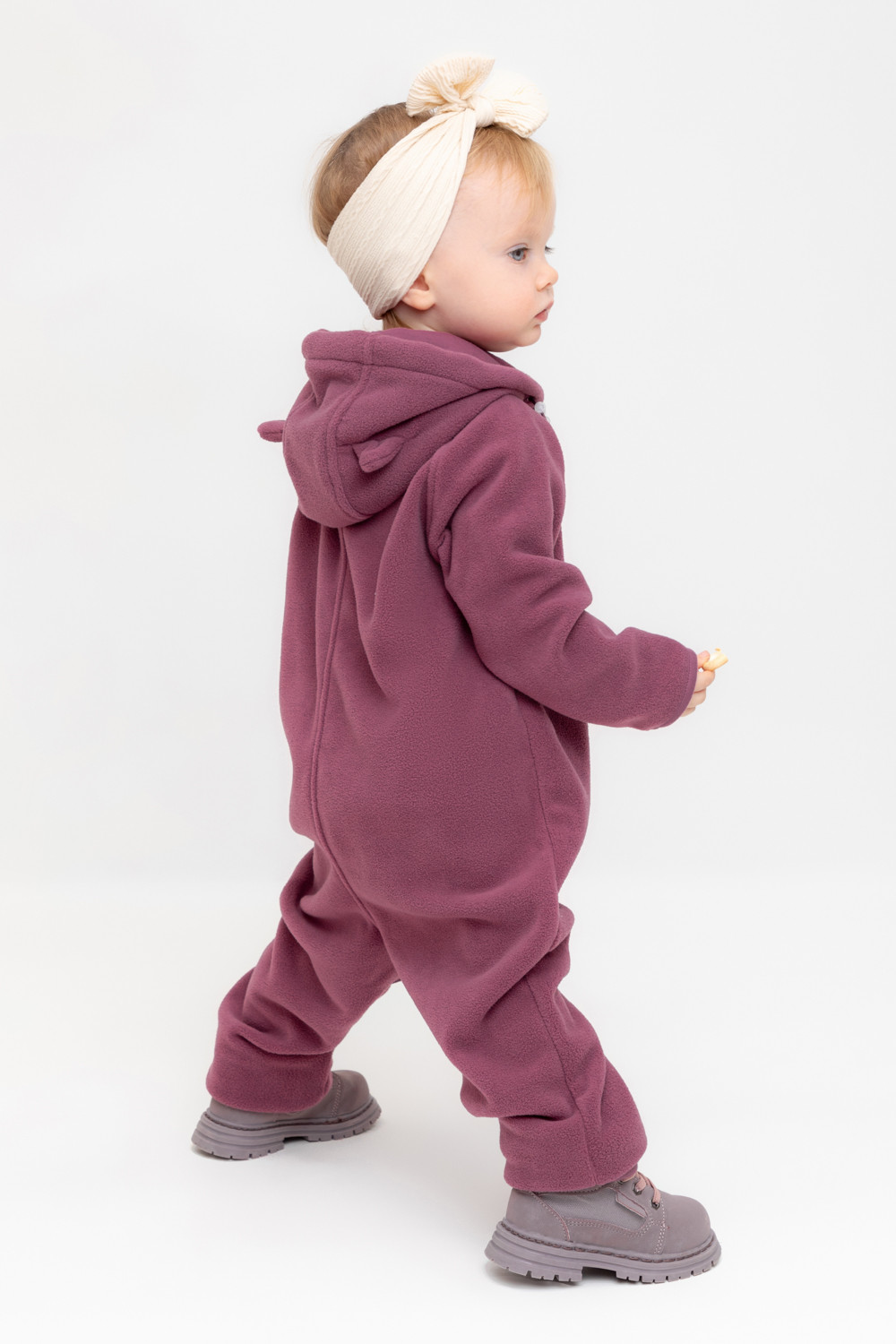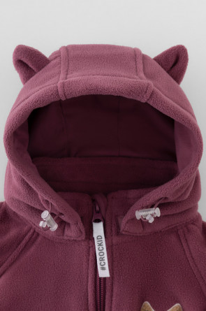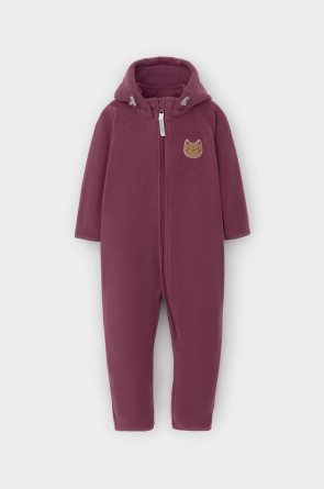 Флисовый комбинезон со съёмным капюшоном для девочки. У изделия высокий воротник и съёмный капюшон на кнопках. Застёгивается на удлинённую молнию. Предусмотрена защита шеи и подбородка. В размерах 40/62 - 48/74 на рукавах и штанинах есть удобные отвороты. Комбинезон сохраняет цвет и форму после многократных стирок.