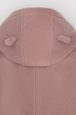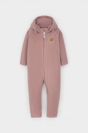 Флисовый комбинезон со съёмным капюшоном для девочки. У изделия высокий воротник и съёмный капюшон на кнопках. Застёгивается на удлинённую молнию. Предусмотрена защита шеи и подбородка. В размерах 40/62 - 48/74 на рукавах и штанинах есть удобные отвороты. Комбинезон сохраняет цвет и форму после многократных стирок.