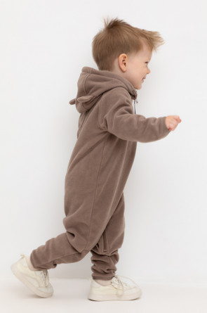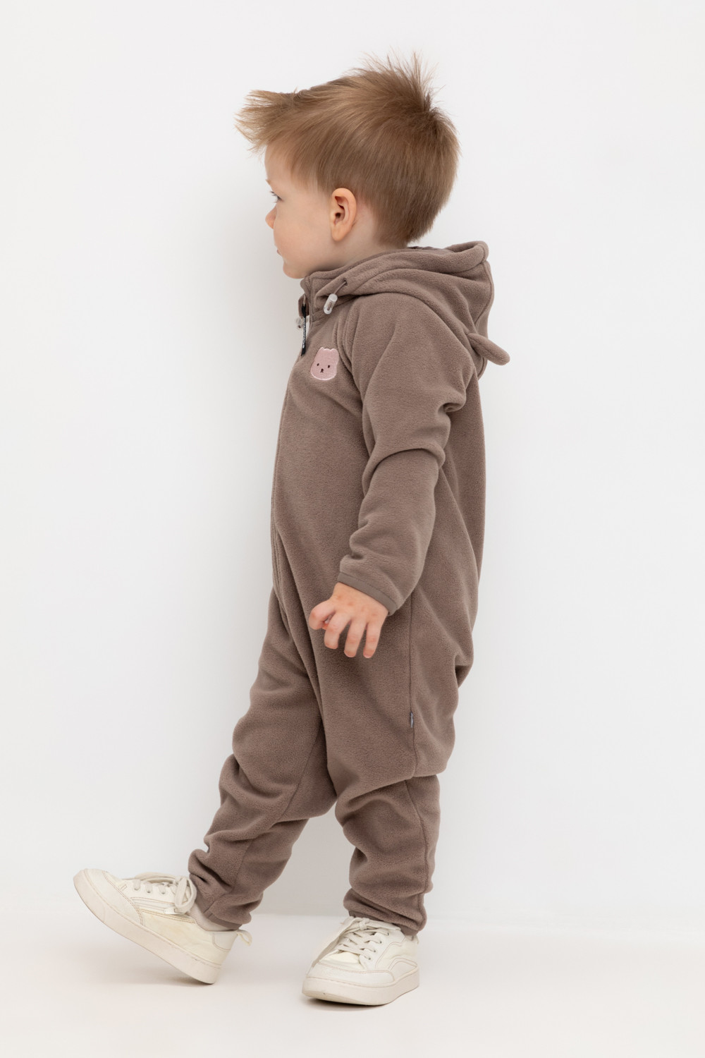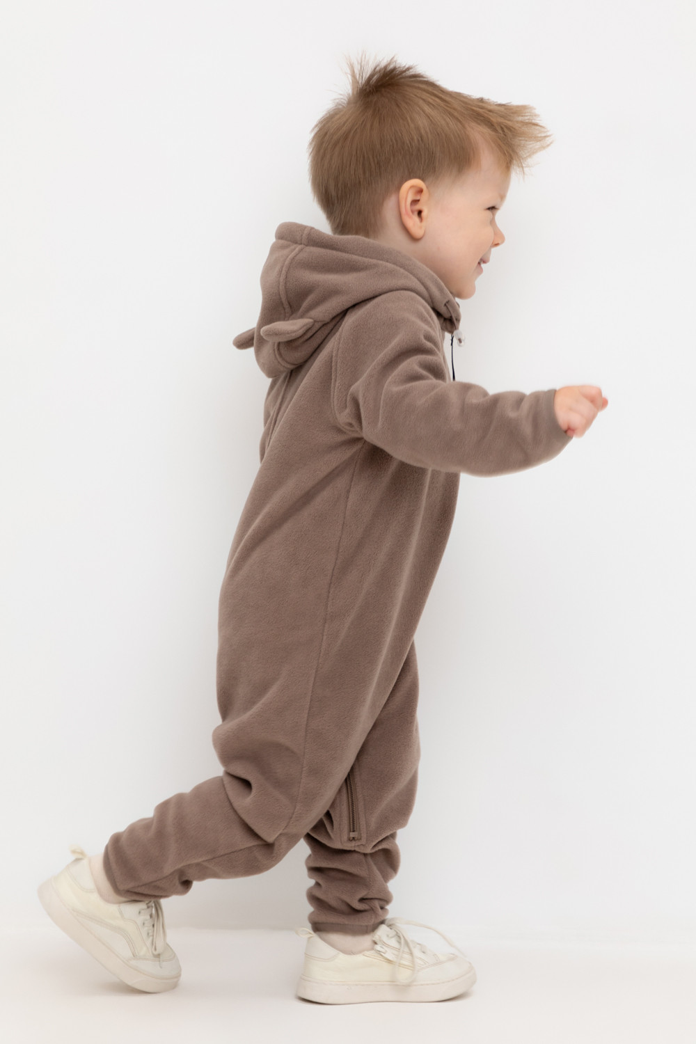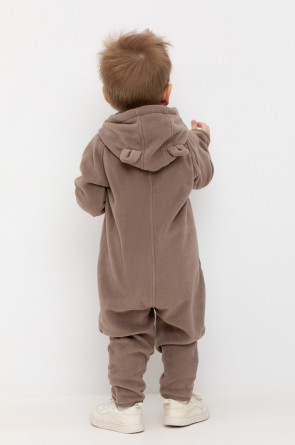 Флисовый комбинезон со съёмным капюшоном для мальчика. У изделия высокий воротник и съёмный капюшон на кнопках с декоративными ушками и подкладом из супрема. Застёгивается на удлинённую молнию. Предусмотрена защита шеи и подбородка. В размерах 40/62 - 48/74 на рукавах и штанинах есть удобные отвороты. Оригинальная набивка выполнена из стойких, гипоаллергенных текстильных красителей. Комбинезон сохраняет цвет и форму после многократных стирок.