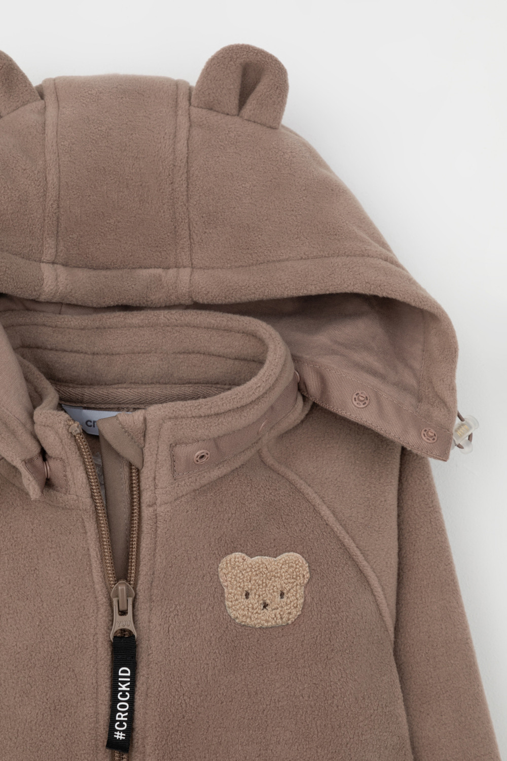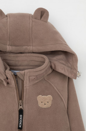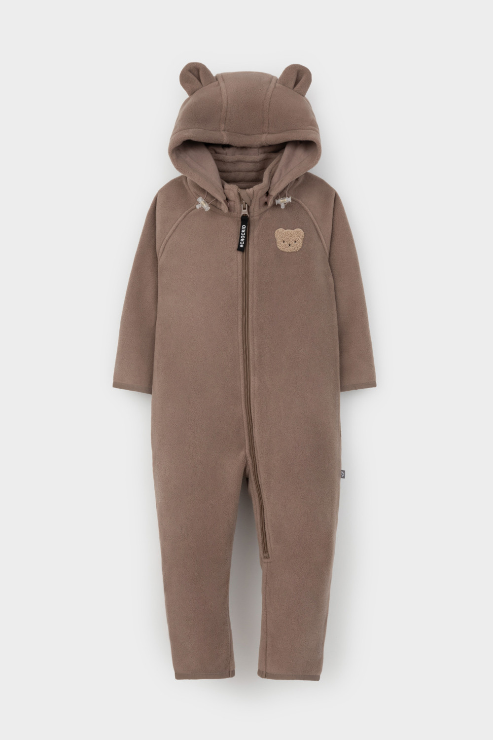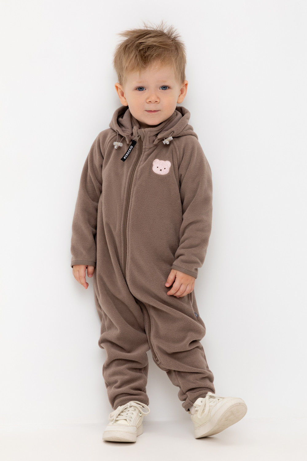 Флисовый комбинезон со съёмным капюшоном для мальчика. У изделия высокий воротник и съёмный капюшон на кнопках с декоративными ушками и подкладом из супрема. Застёгивается на удлинённую молнию. Предусмотрена защита шеи и подбородка. В размерах 40/62 - 48/74 на рукавах и штанинах есть удобные отвороты. Оригинальная набивка выполнена из стойких, гипоаллергенных текстильных красителей. Комбинезон сохраняет цвет и форму после многократных стирок.