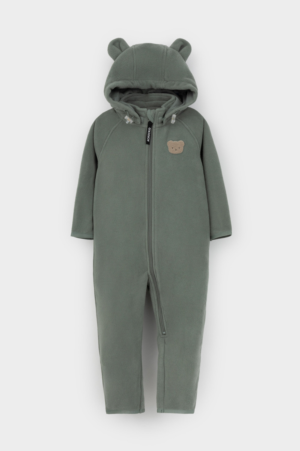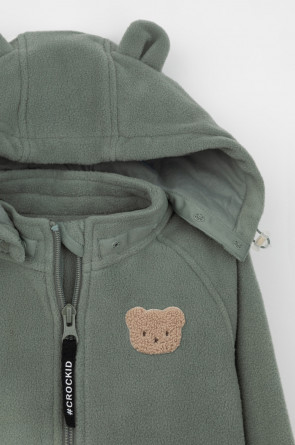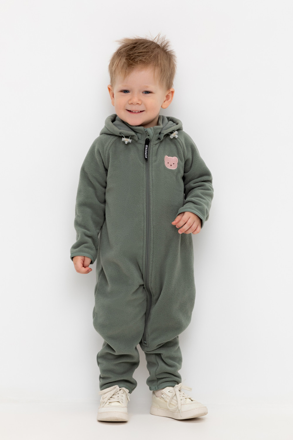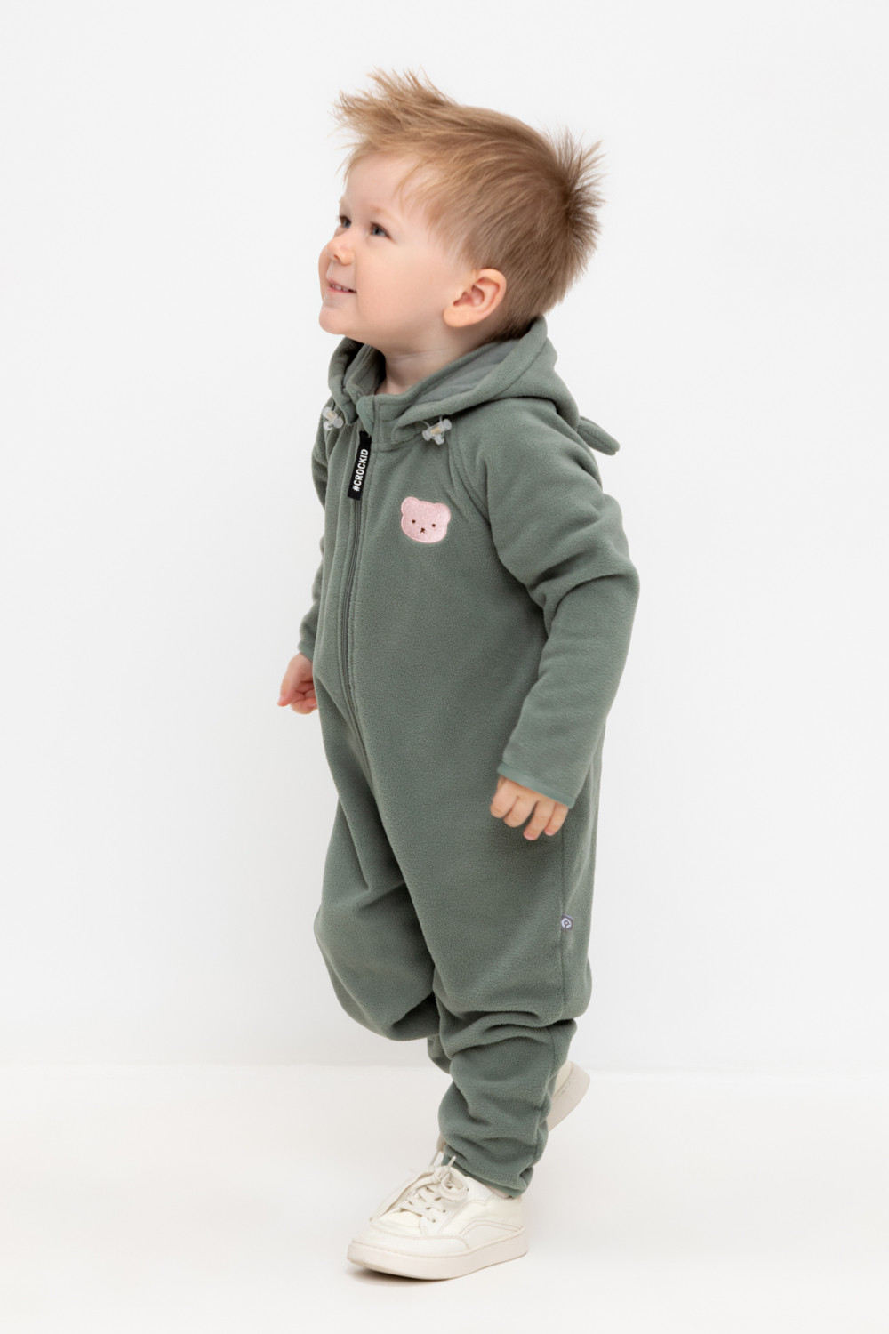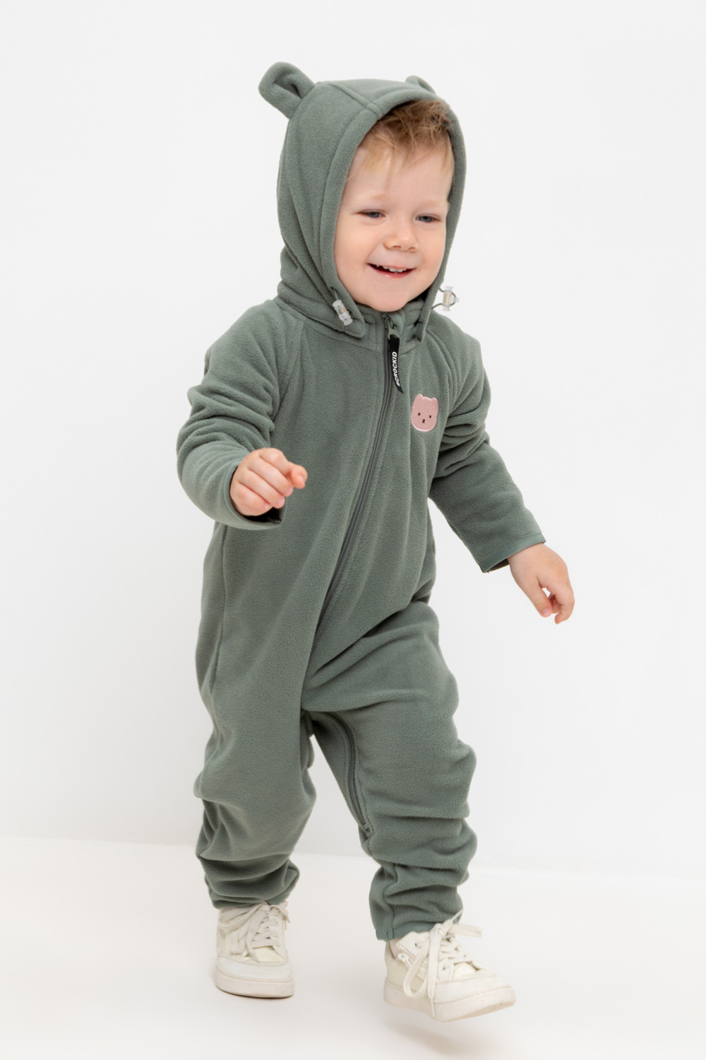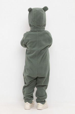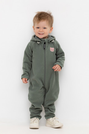 Флисовый комбинезон со съёмным капюшоном для мальчика. У изделия высокий воротник и съёмный капюшон на кнопках с декоративными ушками и подкладом из супрема. Застёгивается на удлинённую молнию. Предусмотрена защита шеи и подбородка. В размерах 40/62 - 48/74 на рукавах и штанинах есть удобные отвороты. Оригинальная набивка выполнена из стойких, гипоаллергенных текстильных красителей. Комбинезон сохраняет цвет и форму после многократных стирок.