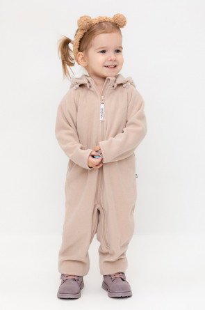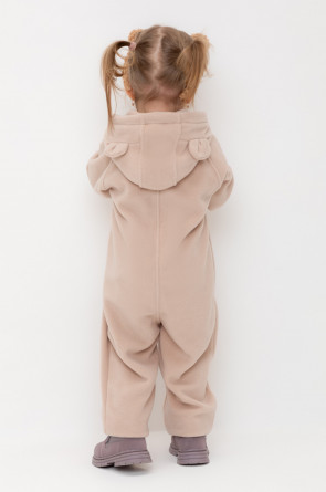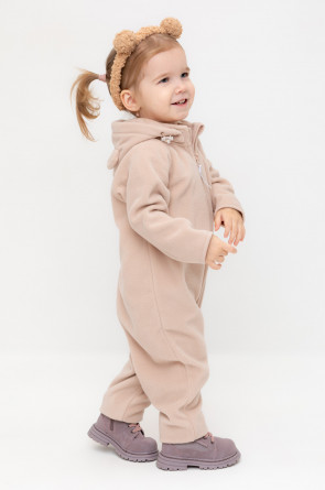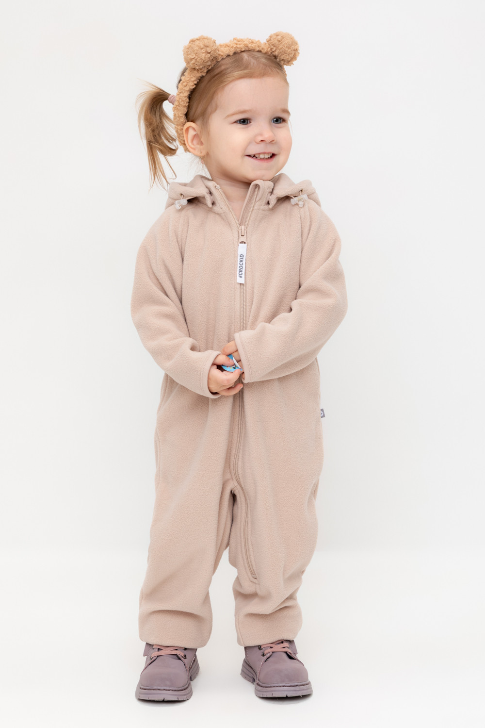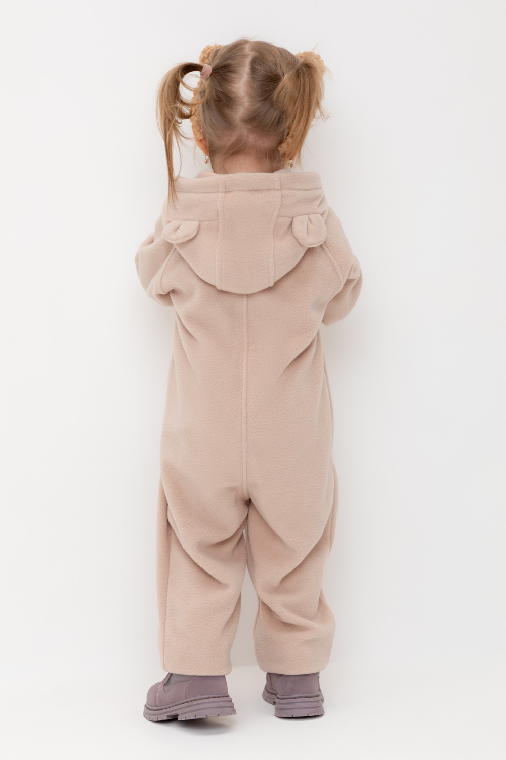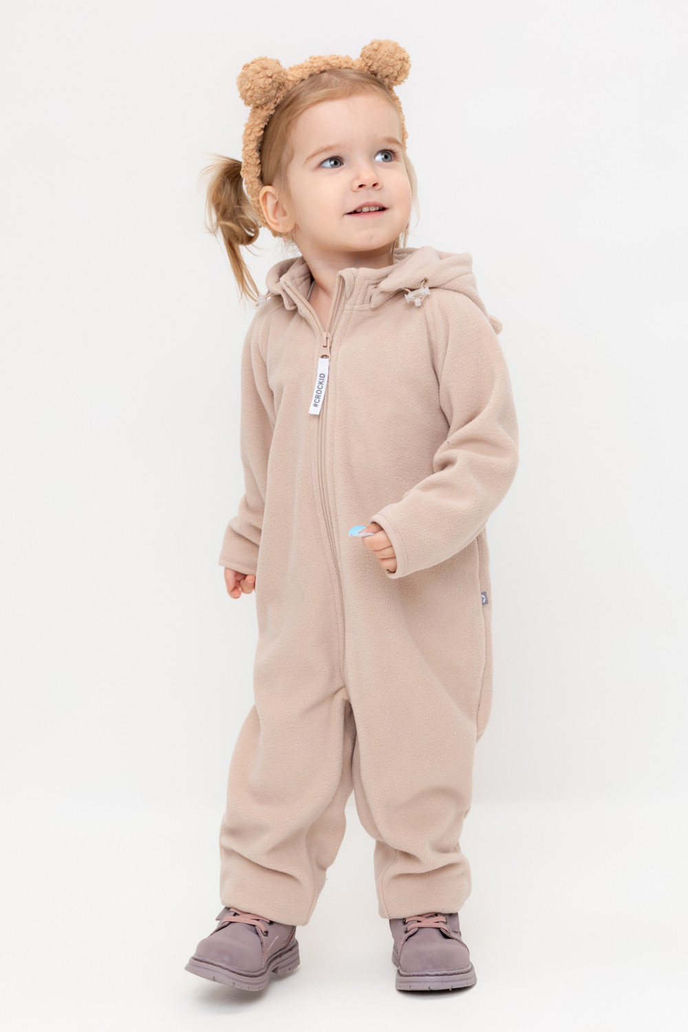 Флисовый комбинезон со съёмным капюшоном для девочки. У изделия высокий воротник и съёмный капюшон на кнопках с декоративными ушками и подкладом из супрема. Застёгивается на удлинённую молнию. Предусмотрена защита шеи и подбородка. В размерах 40/62 - 48/74 на рукавах и штанинах есть удобные отвороты. Комбинезон сохраняет цвет и форму после многократных стирок.