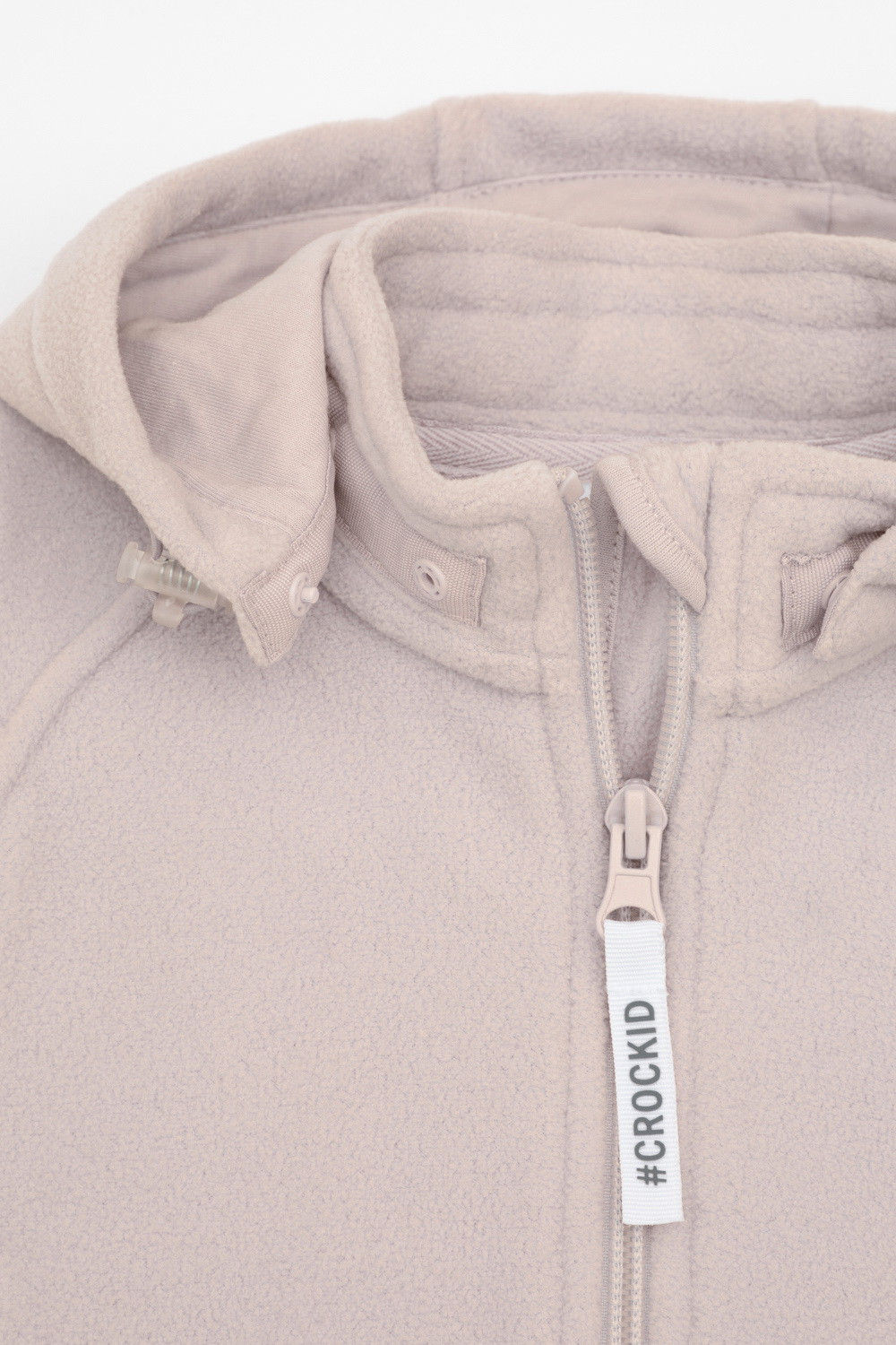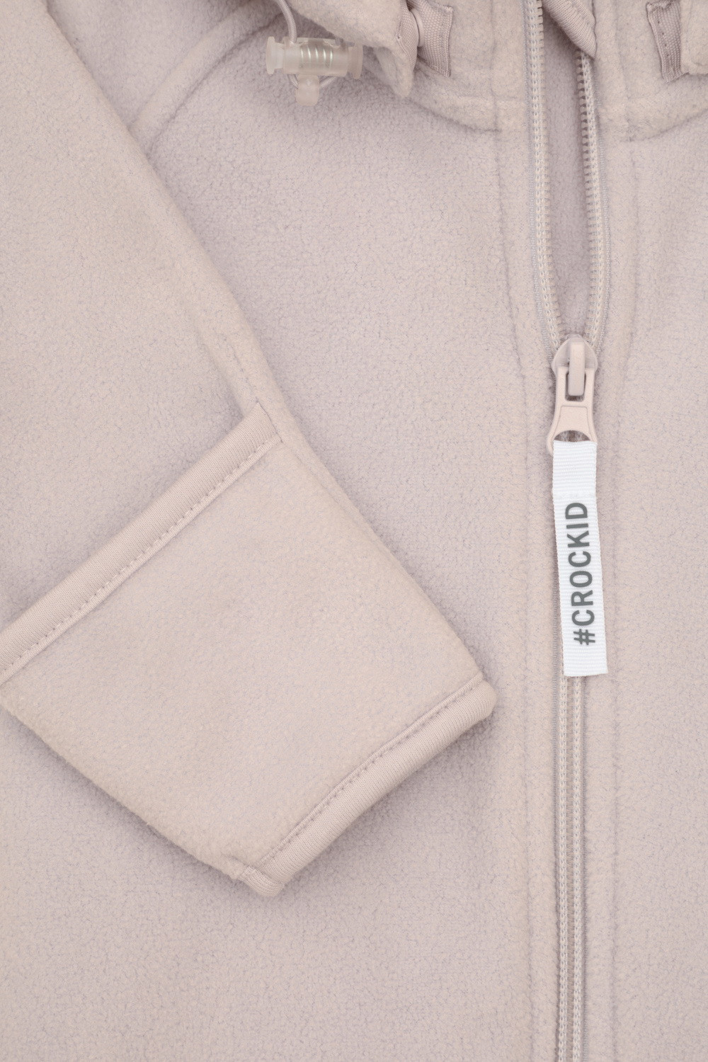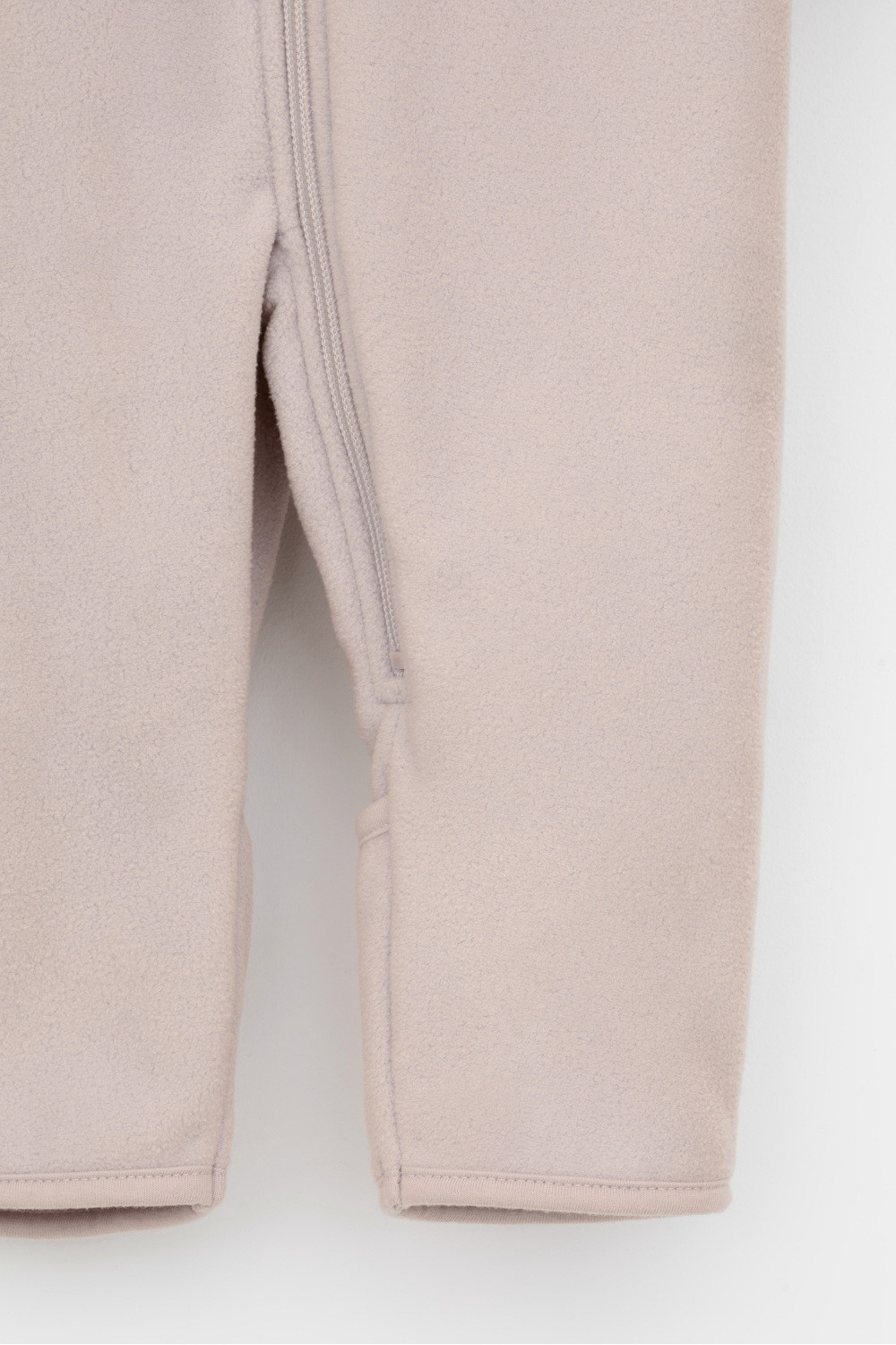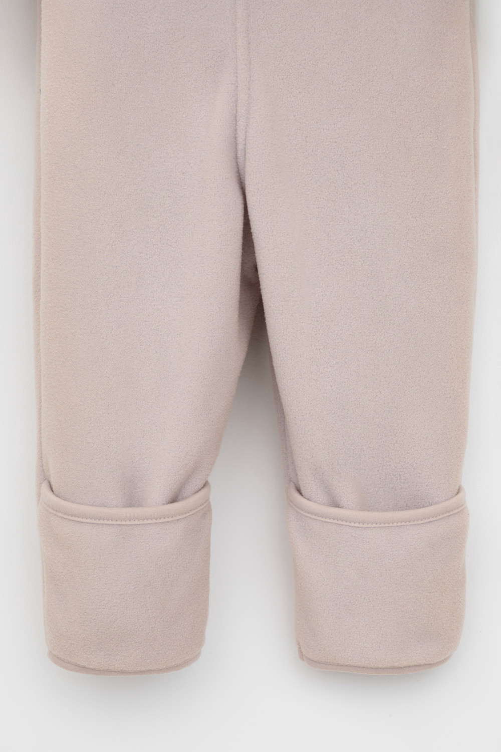 Флисовый комбинезон со съёмным капюшоном для девочки. У изделия высокий воротник и съёмный капюшон на кнопках с декоративными ушками и подкладом из супрема. Застёгивается на удлинённую молнию. Предусмотрена защита шеи и подбородка. В размерах 40/62 - 48/74 на рукавах и штанинах есть удобные отвороты. Комбинезон сохраняет цвет и форму после многократных стирок.