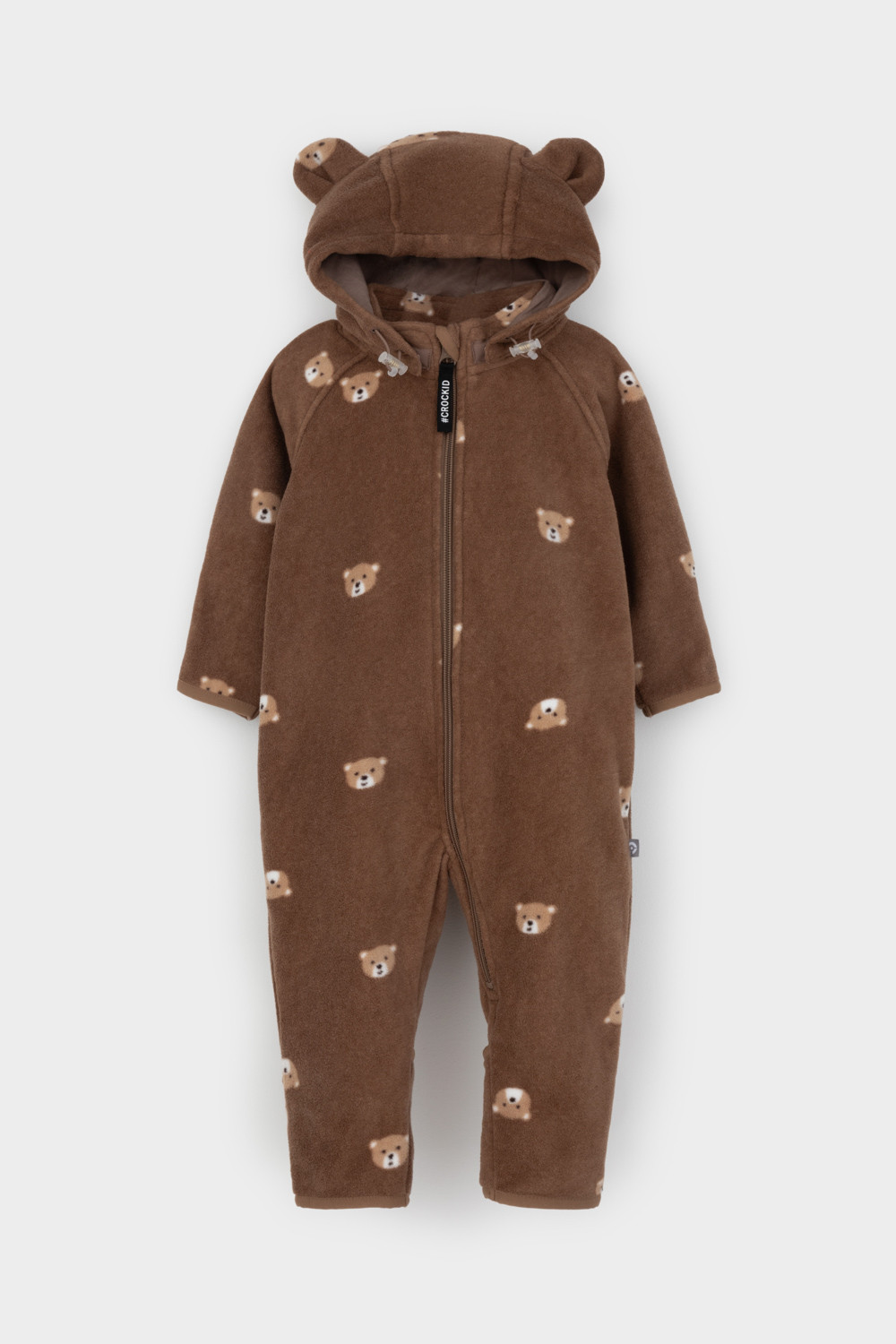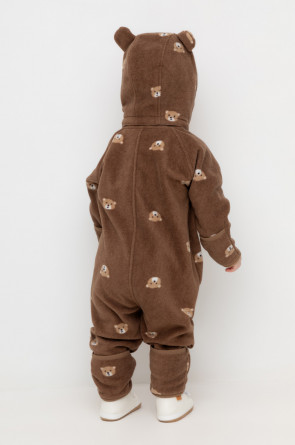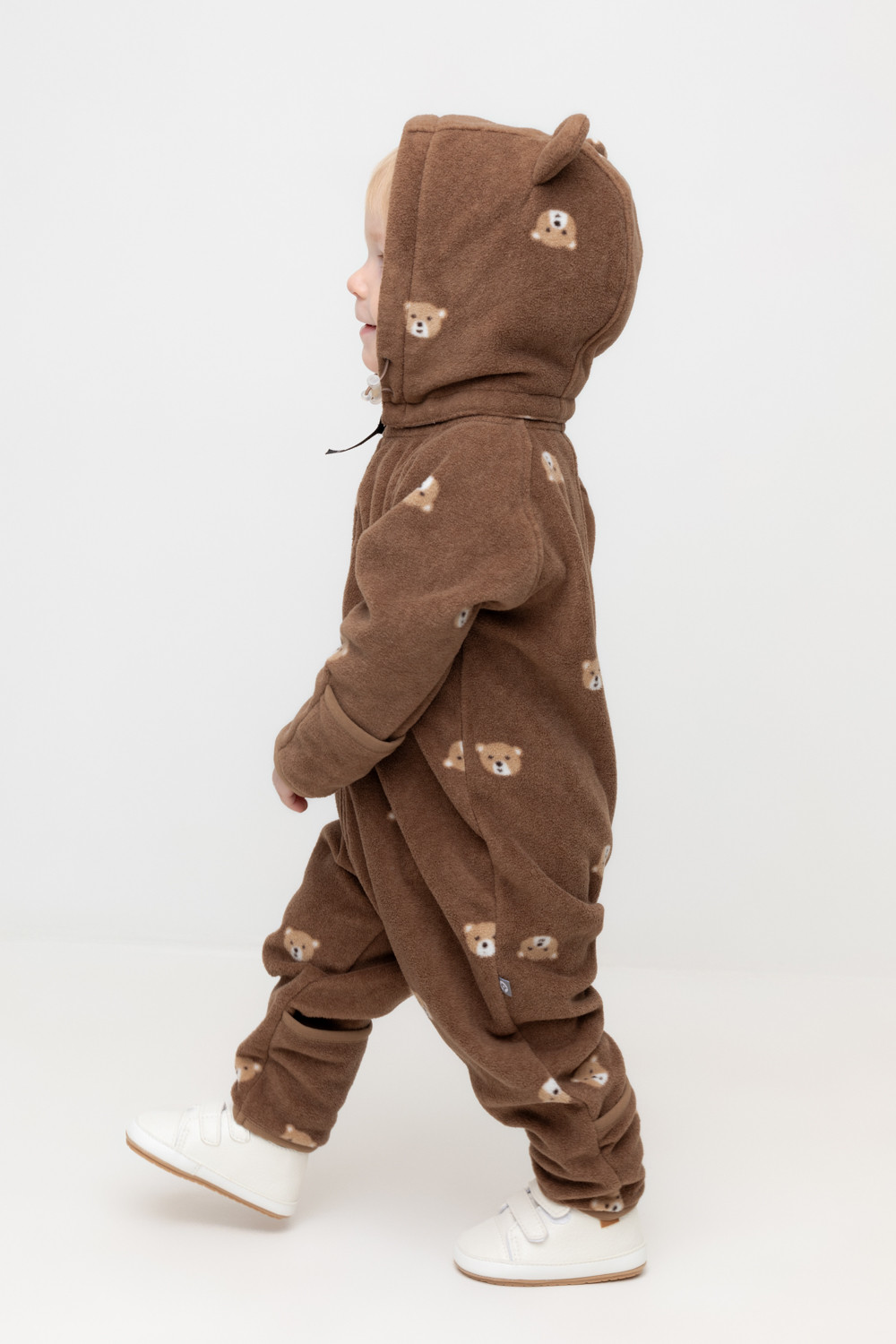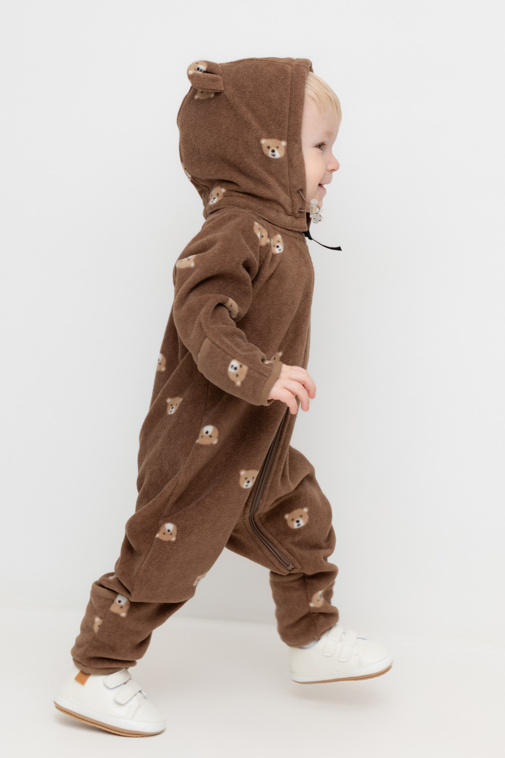 Флисовый комбинезон со съёмным капюшоном для мальчика. У изделия высокий воротник и съёмный капюшон на кнопках с декоративными ушками и подкладом из супрема. Застёгивается на удлинённую молнию. Предусмотрена защита шеи и подбородка. В размерах 40/62 - 48/74 на рукавах и штанинах есть удобные отвороты. Оригинальная набивка выполнена из стойких, гипоаллергенных текстильных красителей. Комбинезон сохраняет цвет и форму после многократных стирок.
