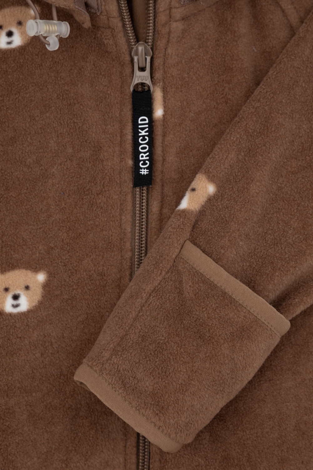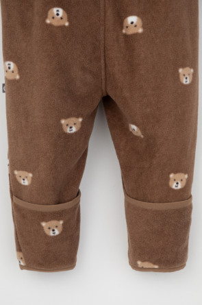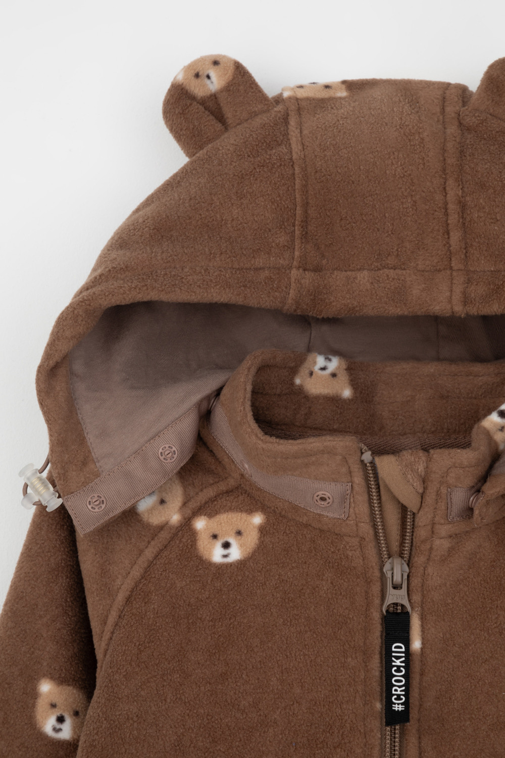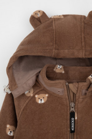 Флисовый комбинезон со съёмным капюшоном для мальчика. У изделия высокий воротник и съёмный капюшон на кнопках с декоративными ушками и подкладом из супрема. Застёгивается на удлинённую молнию. Предусмотрена защита шеи и подбородка. В размерах 40/62 - 48/74 на рукавах и штанинах есть удобные отвороты. Оригинальная набивка выполнена из стойких, гипоаллергенных текстильных красителей. Комбинезон сохраняет цвет и форму после многократных стирок.
