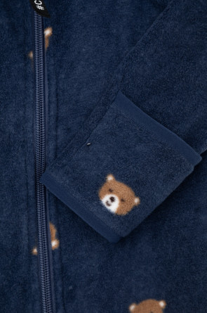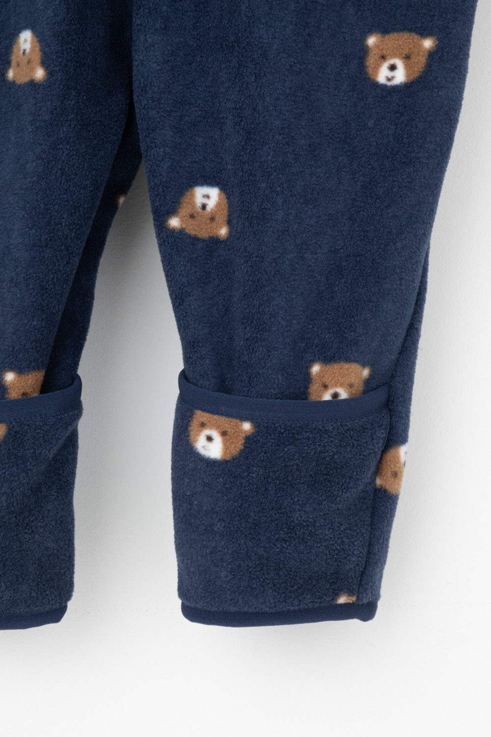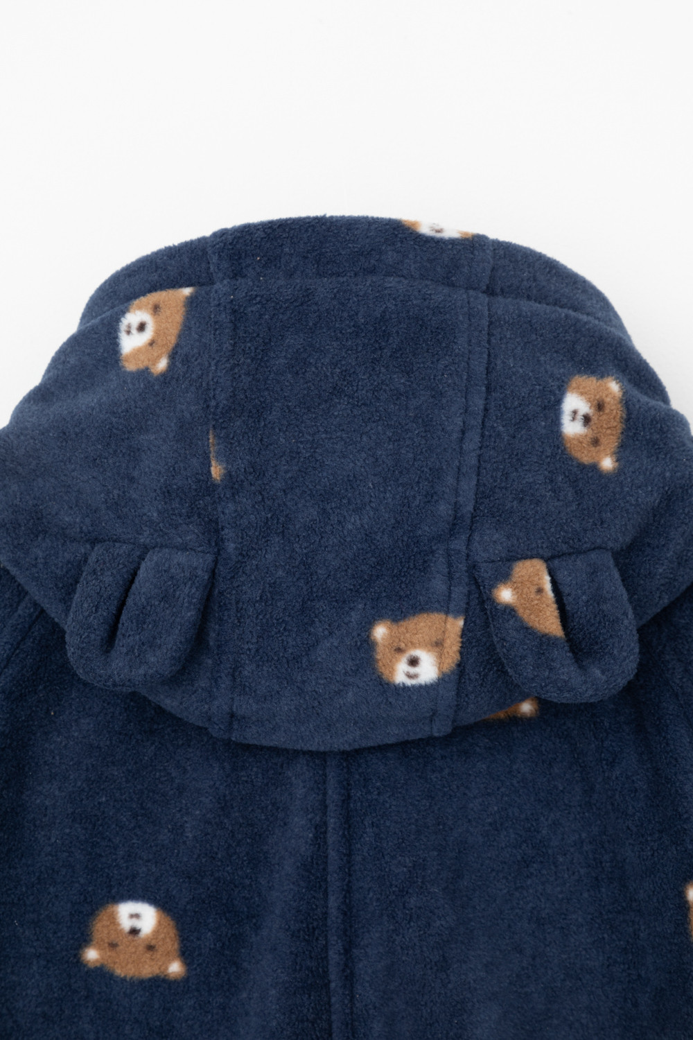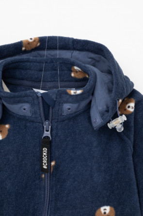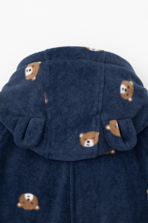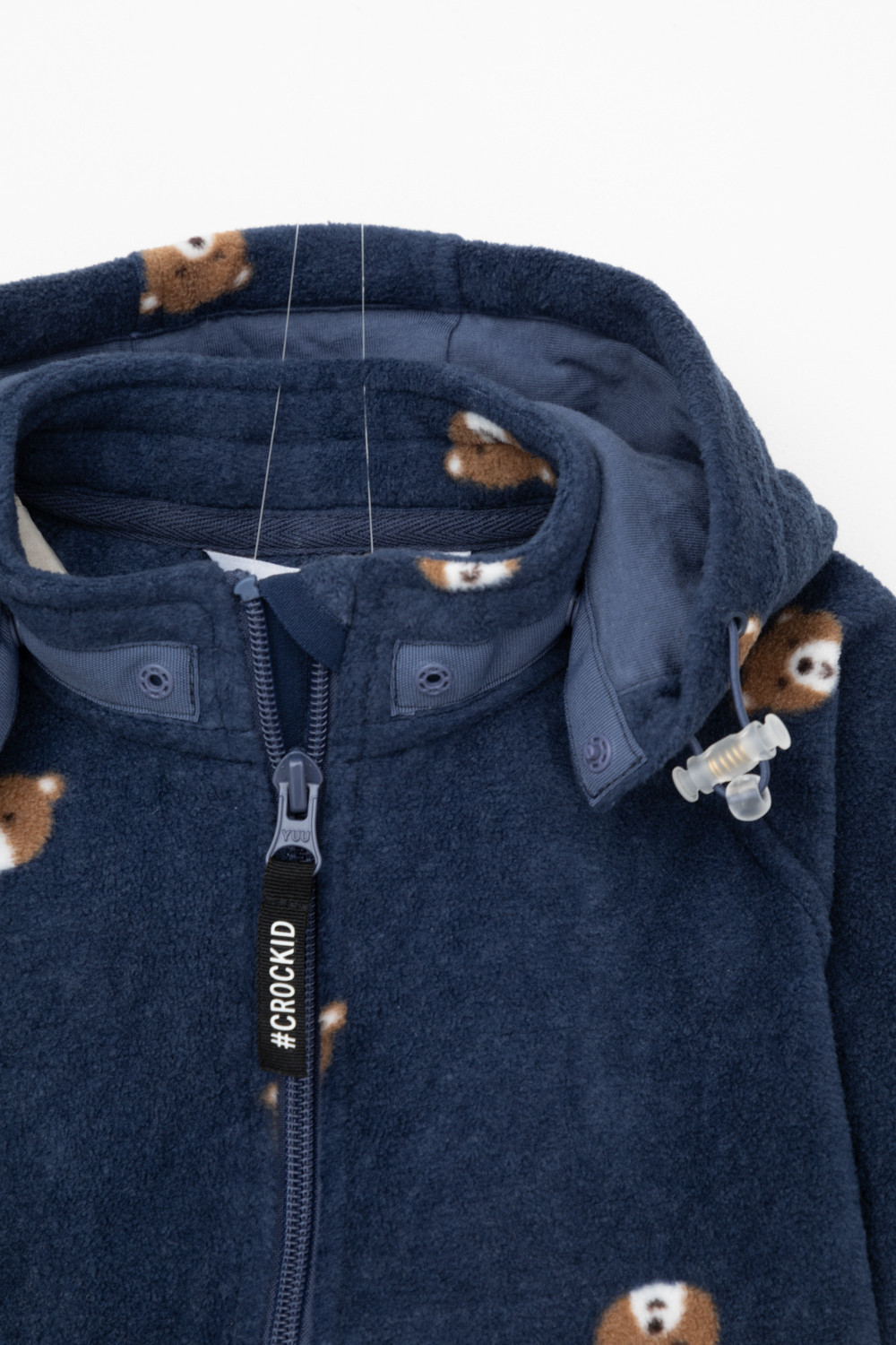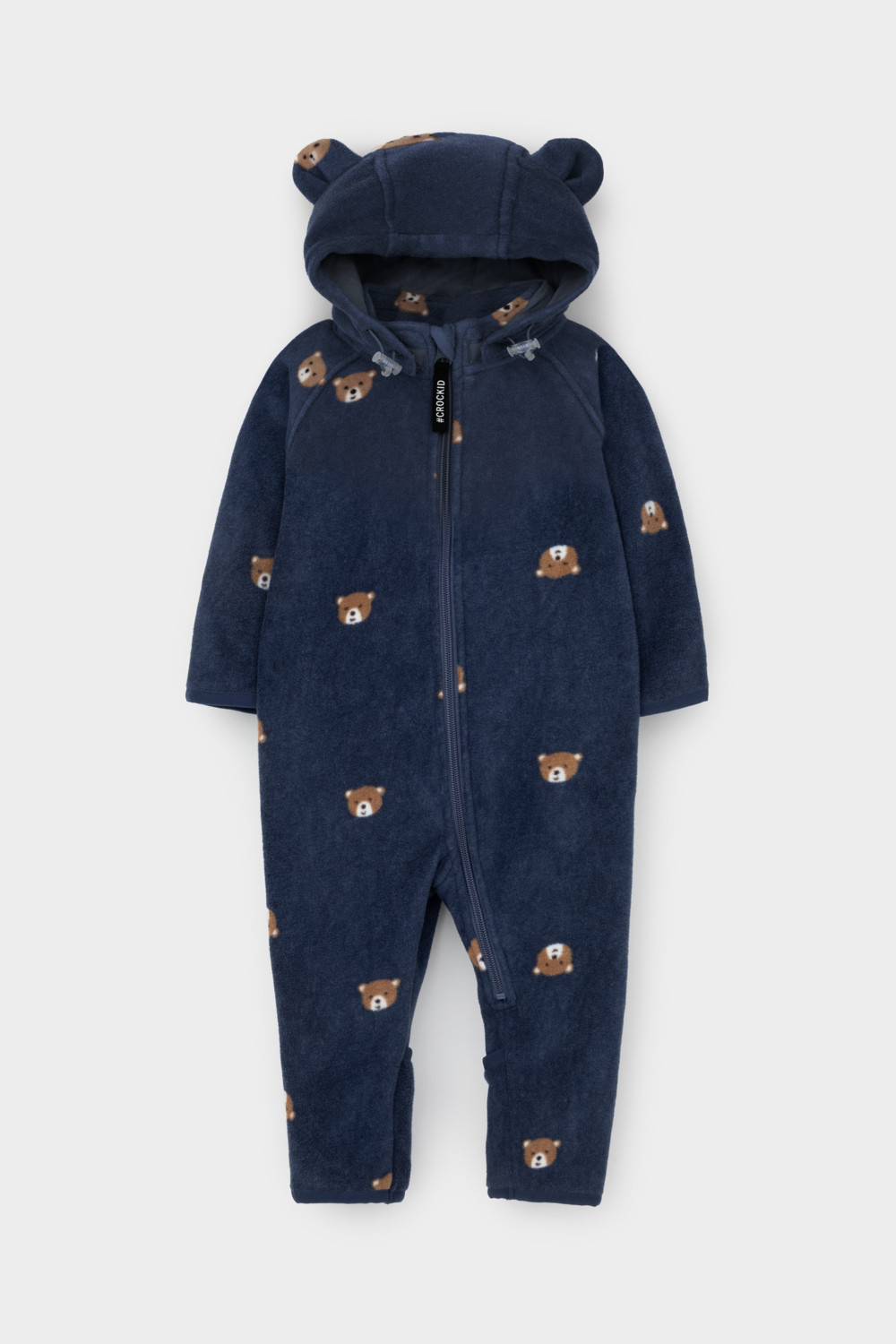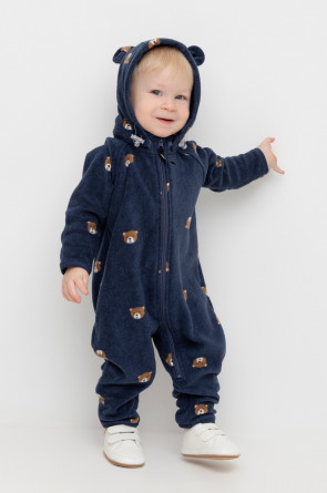 Флисовый комбинезон со съёмным капюшоном для мальчика. У изделия высокий воротник и съёмный капюшон на кнопках с декоративными ушками и подкладом из супрема. Застёгивается на удлинённую молнию. Предусмотрена защита шеи и подбородка. В размерах 40/62 - 48/74 на рукавах и штанинах есть удобные отвороты. Оригинальная набивка выполнена из стойких, гипоаллергенных текстильных красителей. Комбинезон сохраняет цвет и форму после многократных стирок.