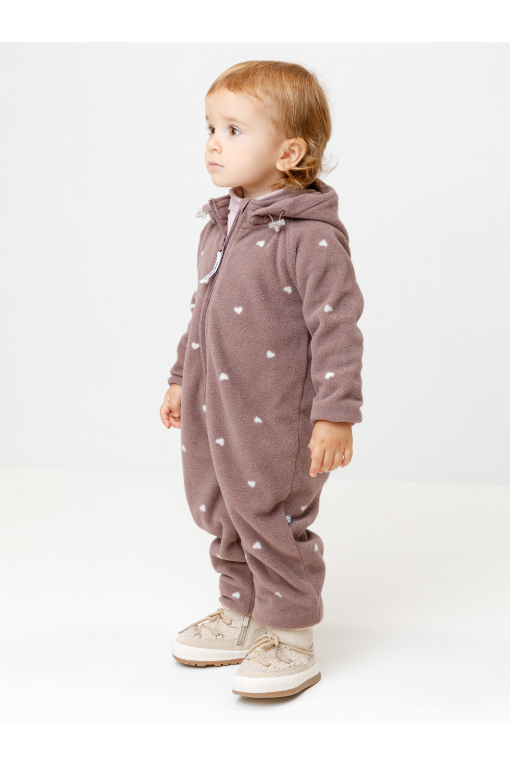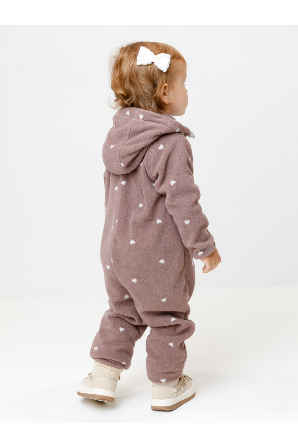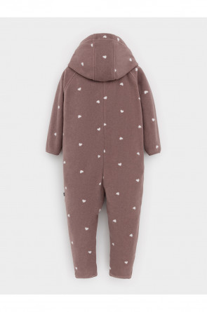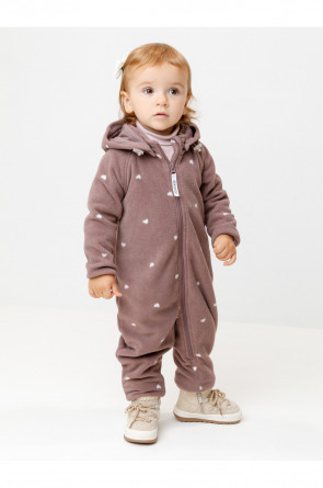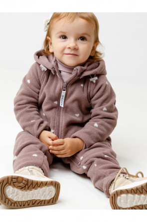 Флисовый комбинезон для девочки со съёмным капюшоном. Капюшон регулируется по ширине с помощью эластичной утяжки со стопперами. Подклад выполнен из гладкого трикотажа супрем, произведённого из высококачественного натурального хлопка. Застёгивается на удлинённую молнию с мягкой защитой шеи и подбородка. В размерах 62, 68 и 74 на рукавах и ножках есть отвороты. Оригинальная набивка выполнена из стойких, гипоаллергенных текстильных красителей. Комбинезон сохраняет цвет и форму после многократных стирок.