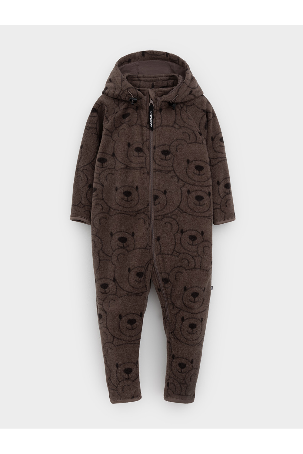 Флисовый комбинезон для мальчика со съёмным капюшоном. Капюшон регулируется по ширине с помощью эластичной утяжки со стопперами. Подклад выполнен из гладкого трикотажа супрем, произведённого из высококачественного натурального хлопка. Застёгивается на удлинённую молнию с мягкой защитой шеи и подбородка. В размерах 62, 68 и 74 на рукавах и ножках есть отвороты. Оригинальная набивка выполнена из стойких гипоаллергенных текстильных красителей. Комбинезон сохраняет цвет и форму после многократных стирок.