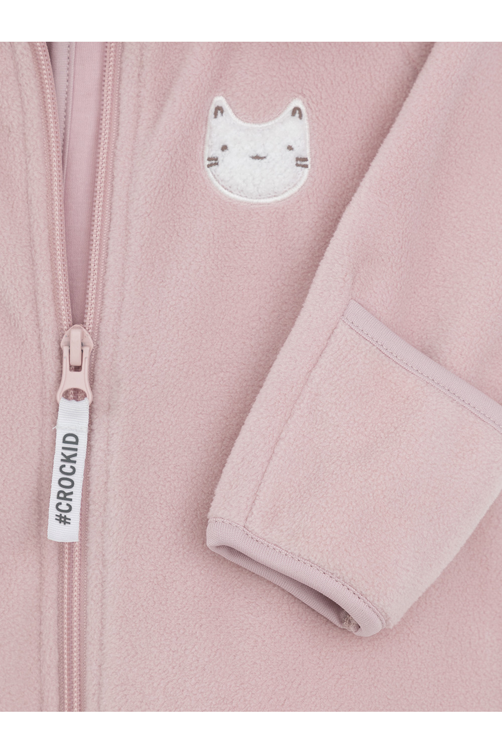 Флисовый комбинезон для девочки со съёмным капюшоном. Капюшон регулируется по ширине с помощью эластичной утяжки со стопперами. Подклад выполнен из гладкого трикотажа супрем, произведённого из высококачественного натурального хлопка. Застёгивается на удлинённую молнию с мягкой защитой шеи и подбородка. В размерах 62, 68 и 74 на рукавах и ножках есть отвороты. Украшен вышивкой. Комбинезон сохраняет цвет и форму после многократных стирок.