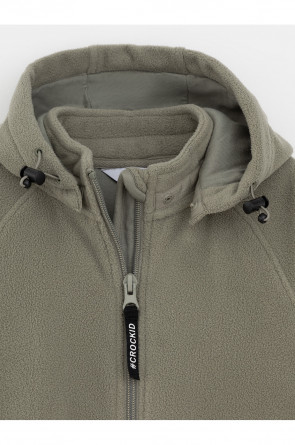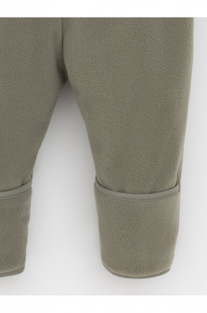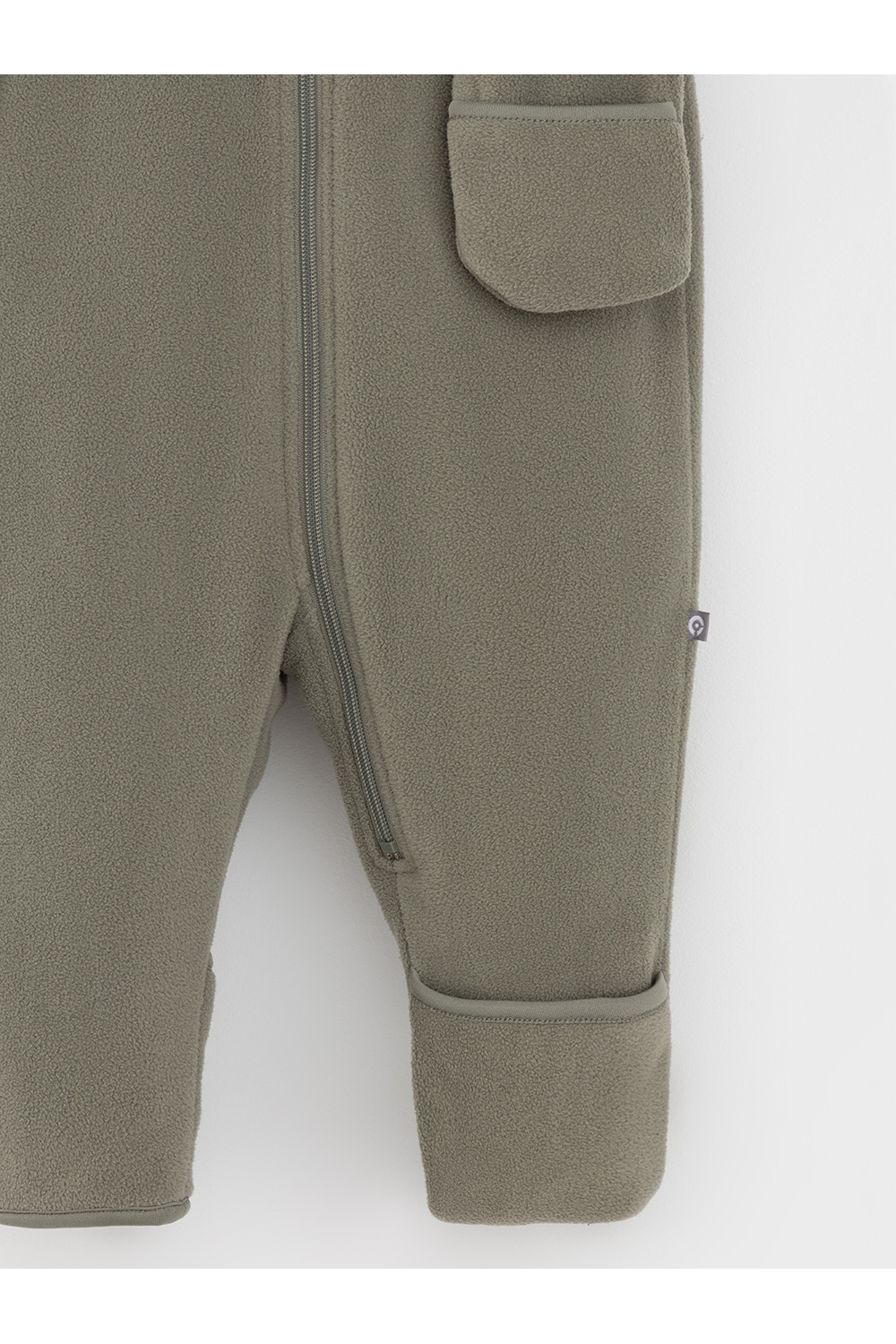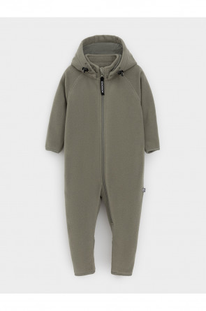 Флисовый комбинезон для мальчика со съёмным капюшоном. Капюшон регулируется по ширине с помощью эластичной утяжки со стопперами. Подклад выполнен из гладкого трикотажа супрем, произведённого из высококачественного натурального хлопка. Застёгивается на удлинённую молнию с мягкой защитой шеи и подбородка. В размерах 62, 68 и 74 на рукавах и ножках есть отвороты. Комбинезон сохраняет цвет и форму после многократных стирок.