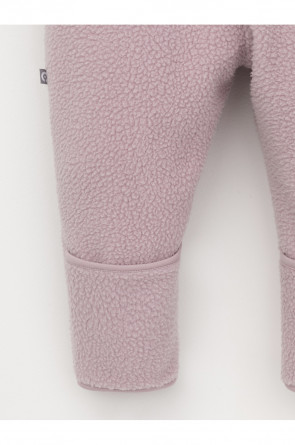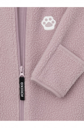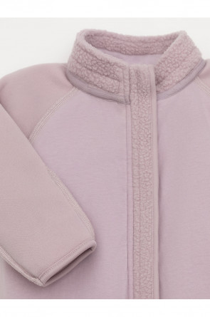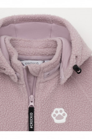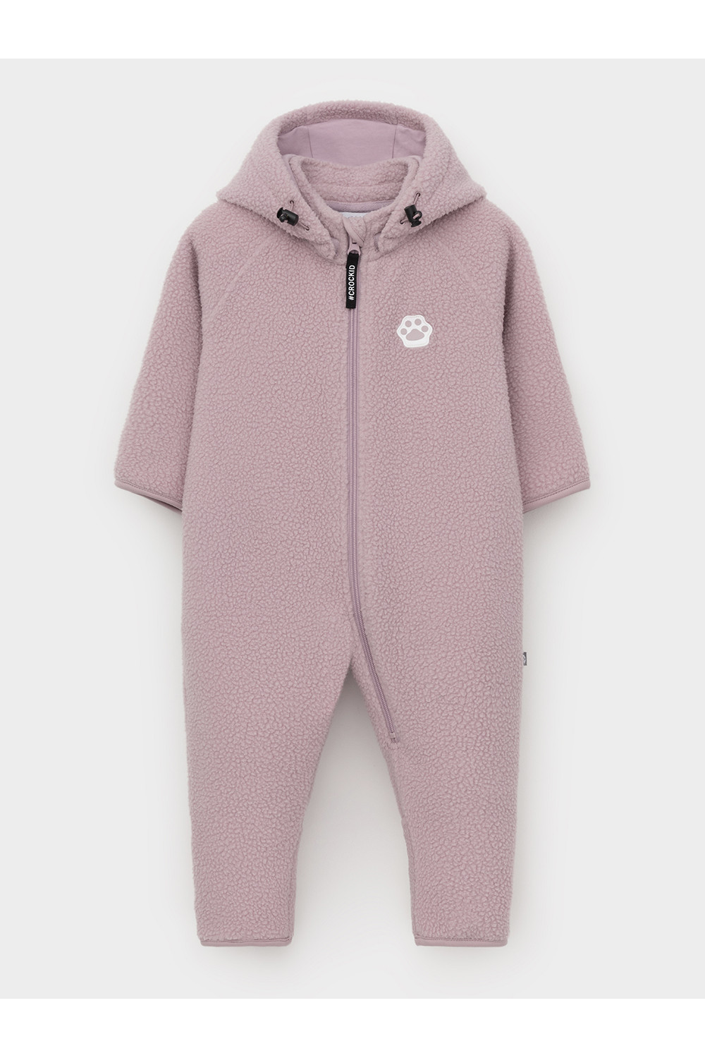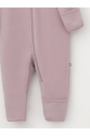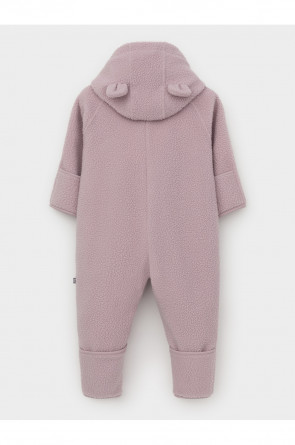 Флисовый комбинезон для девочки со съёмным капюшоном. Капюшон регулируется по ширине с помощью эластичной утяжки со стопперами. Подклад выполнен из гладкого трикотажа супрем, произведённого из высококачественного натурального хлопка. Застёгивается на удлинённую молнию с мягкой защитой шеи и подбородка. В размерах 62, 68 и 74 на рукавах и ножках есть отвороты. Украшен декоративными ушками и нашивкой. Комбинезон сохраняет цвет и форму после многократных стирок.