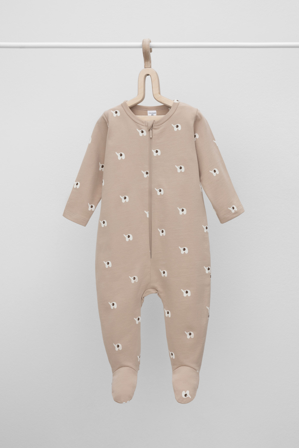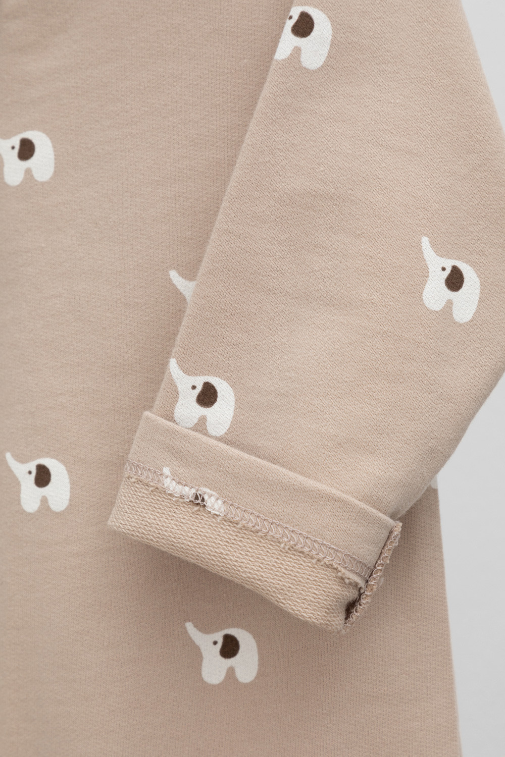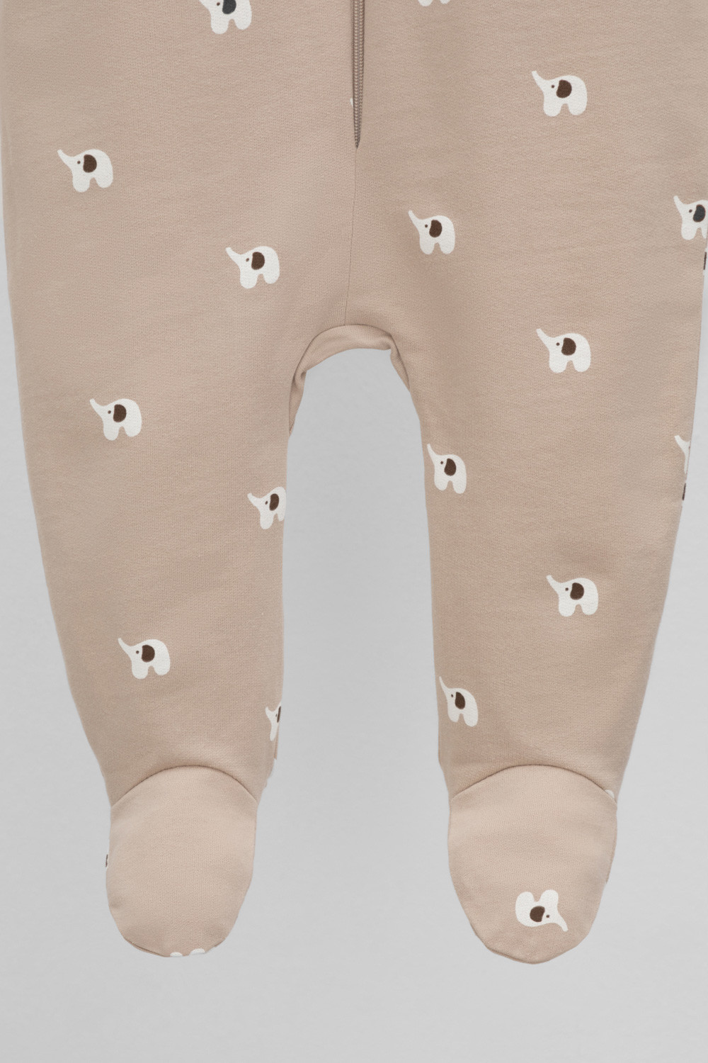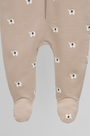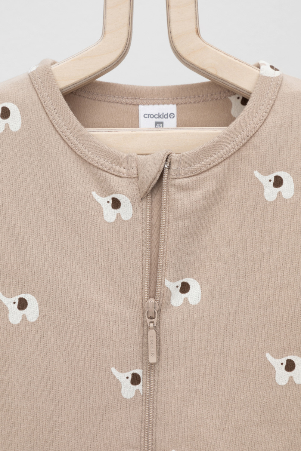 Комбинезон для новорождённых из тонкого трикотажа с начёсом, произведённого из натурального хлопка. Изделие застёгивается спереди на молнию. Оригинальная набивка выполнена из стойких, гипоаллергенных текстильных красителей. Все трикотажные полотна производятся в соответствии с нормами Швейцарского сертификата ЭкоТекс.