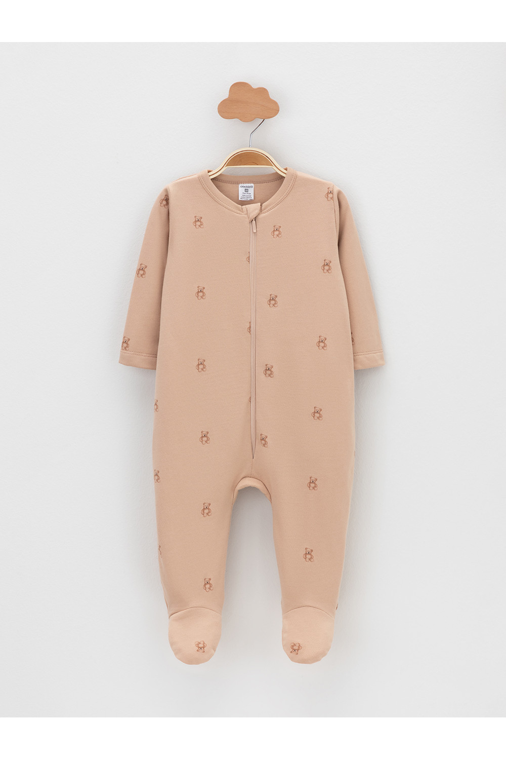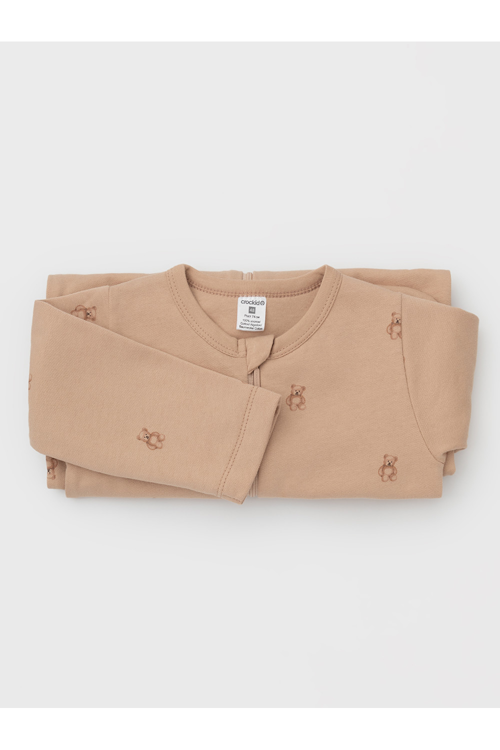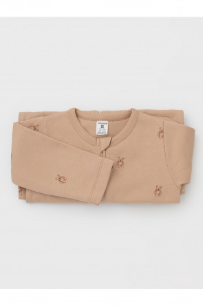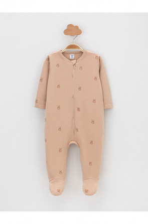 Комбинезон для новорождённых из тонкого футера с начёсом, произведённого из натурального хлопка. Застёгиваются спереди на молнию с мягкой защитой шеи и подбородка. Оригинальная набивка выполнена из стойких гипоаллергенных текстильных красителей. Все трикотажные полотна производятся в соответствии с нормами швейцарского сертификата ЭкоТекс.