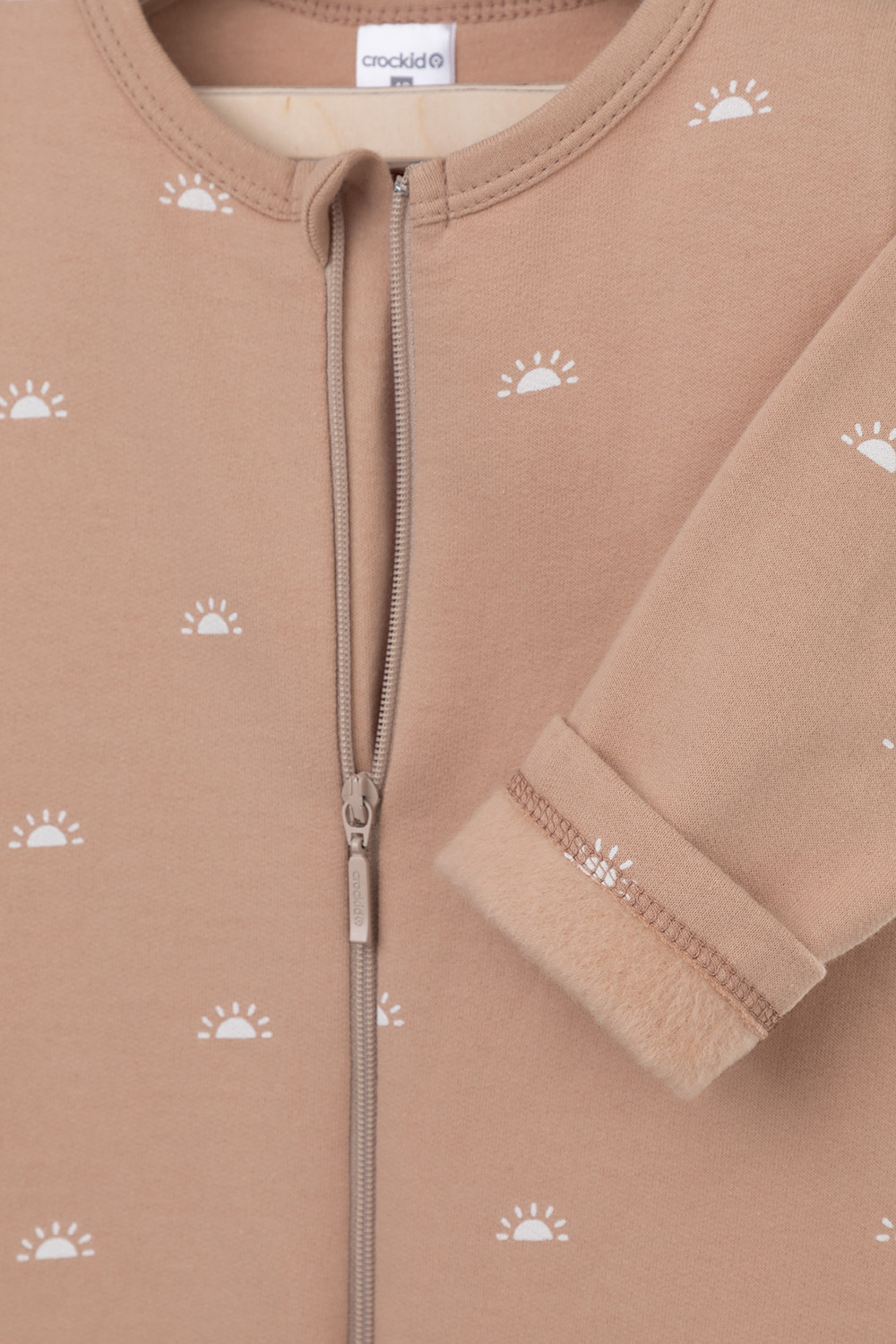 Комбинезон для новорождённых из тонкого трикотажа с начёсом, произведённого из натурального хлопка. Застёгивается спереди на молнию с защитой подбородка. В размере 56 на рукавах предусмотрены антицарапки, швы выполнены наружу. Оригинальная набивка выполнена из стойких гипоаллергенных текстильных красителей. Все трикотажные полотна производятся в соответствии с нормами Швейцарского сертификата ЭкоТекс.