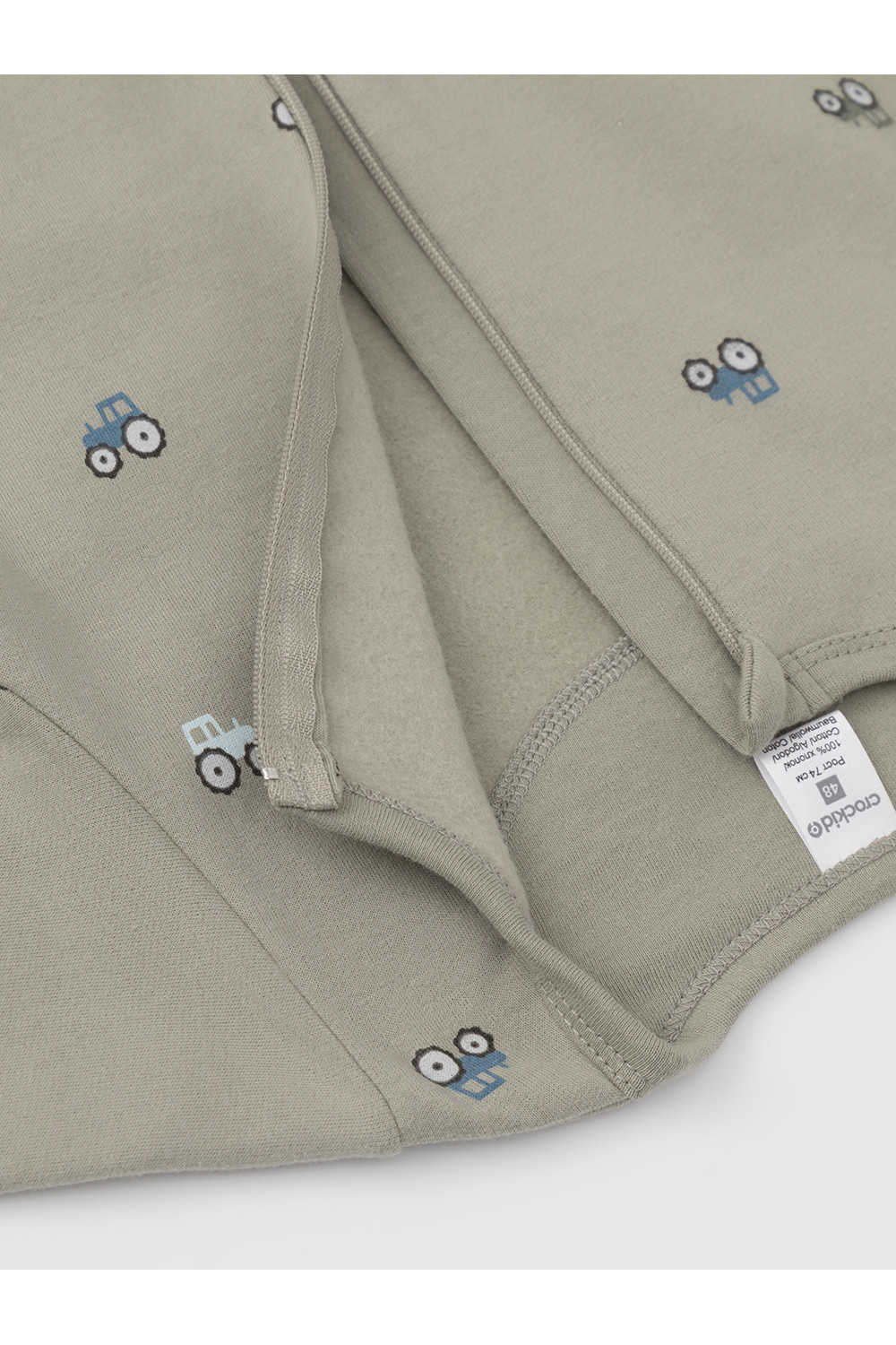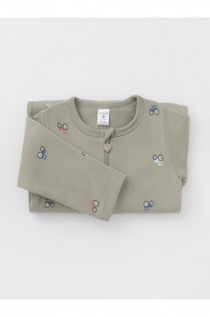Комбинезон для новорождённых из тонкого футера с начёсом, произведённого из натурального хлопка. Застёгиваются спереди на молнию с мягкой защитой шеи и подбородка. Оригинальная набивка выполнена из стойких гипоаллергенных текстильных красителей. Все трикотажные полотна производятся в соответствии с нормами швейцарского сертификата ЭкоТекс.