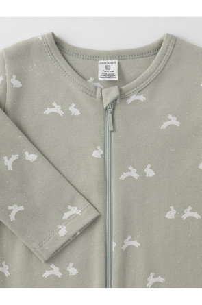 Комбинезон для новорождённых из тонкого футера с начёсом, произведённого из натурального хлопка. Застёгивается спереди на молнию с мягкой защитой шеи и подбородка. Оригинальная набивка выполнена из стойких гипоаллергенных текстильных красителей. Все трикотажные полотна производятся в соответствии с нормами швейцарского сертификата ЭкоТекс.