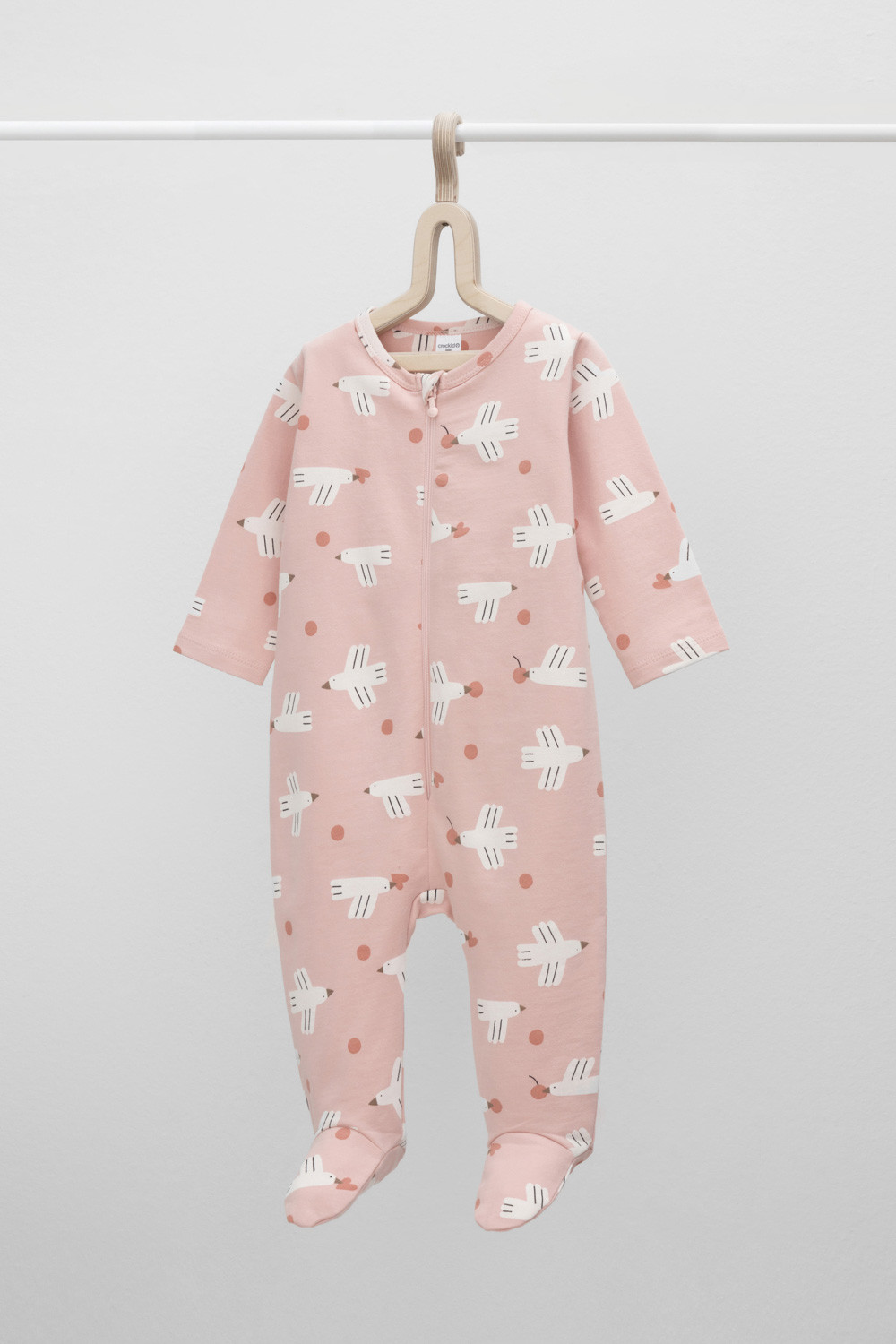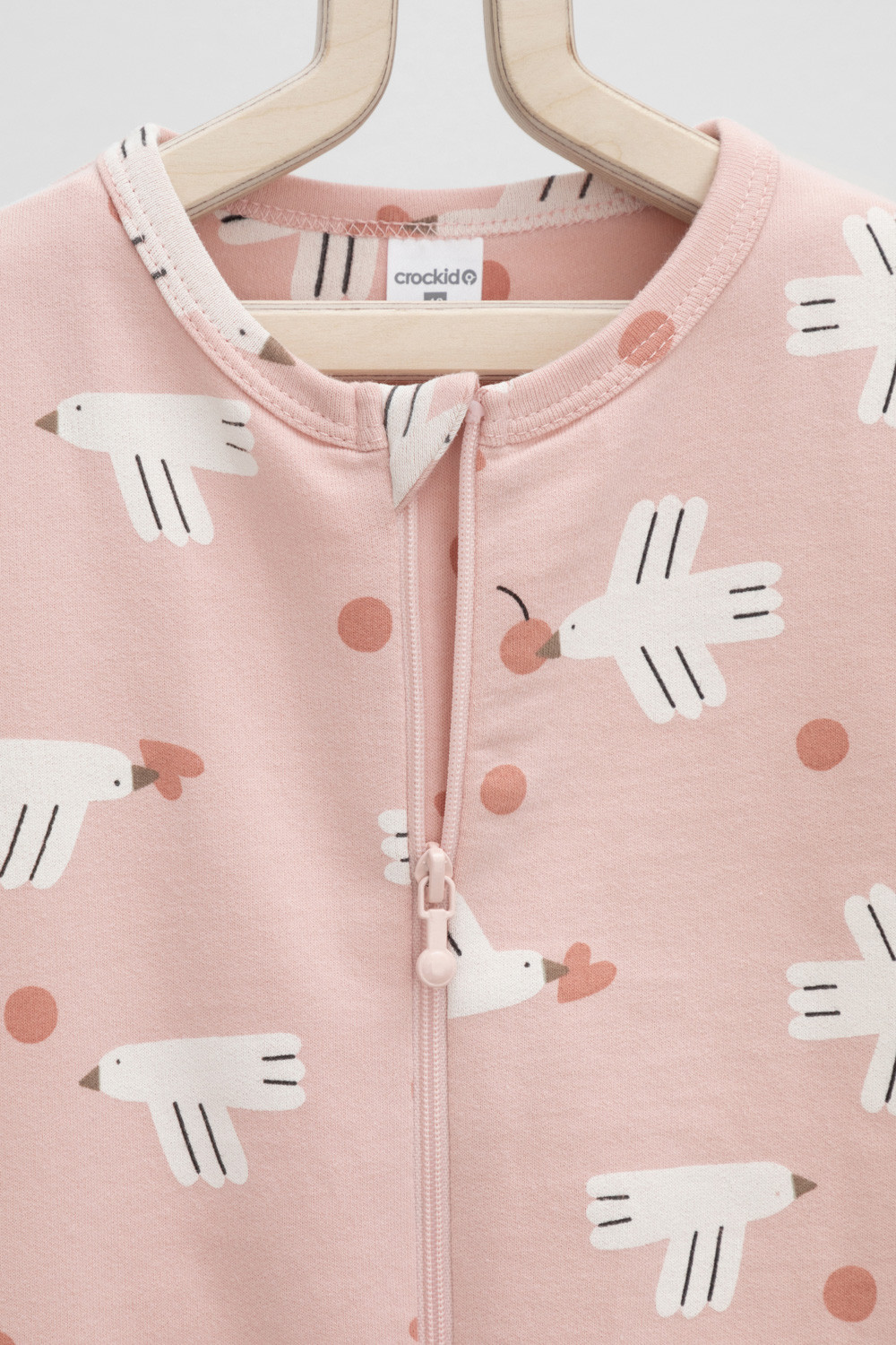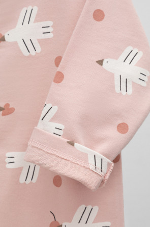 Комбинезон для новорождённых из тонкого трикотажа с начёсом, произведённого из натурального хлопка. Изделие застёгивается спереди на молнию. Оригинальная набивка выполнена из стойких, гипоаллергенных текстильных красителей. Все трикотажные полотна производятся в соответствии с нормами Швейцарского сертификата ЭкоТекс.