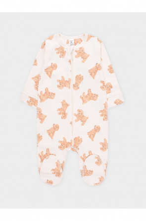 Комбинезон для новорождённых из тонкого футера с начёсом, произведённого из натурального хлопка. Застёгивается спереди на молнию с мягкой защитой шеи и подбородка. Оригинальная набивка выполнена из стойких гипоаллергенных текстильных красителей. Все трикотажные полотна производятся в соответствии с нормами швейцарского сертификата ЭкоТекс.