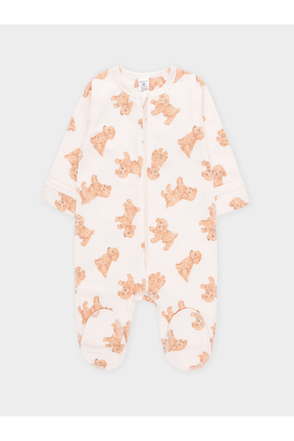 Комбинезон для новорождённых из тонкого футера с начёсом, произведённого из натурального хлопка. Застёгивается спереди на молнию с мягкой защитой шеи и подбородка. Оригинальная набивка выполнена из стойких гипоаллергенных текстильных красителей. Все трикотажные полотна производятся в соответствии с нормами швейцарского сертификата ЭкоТекс.