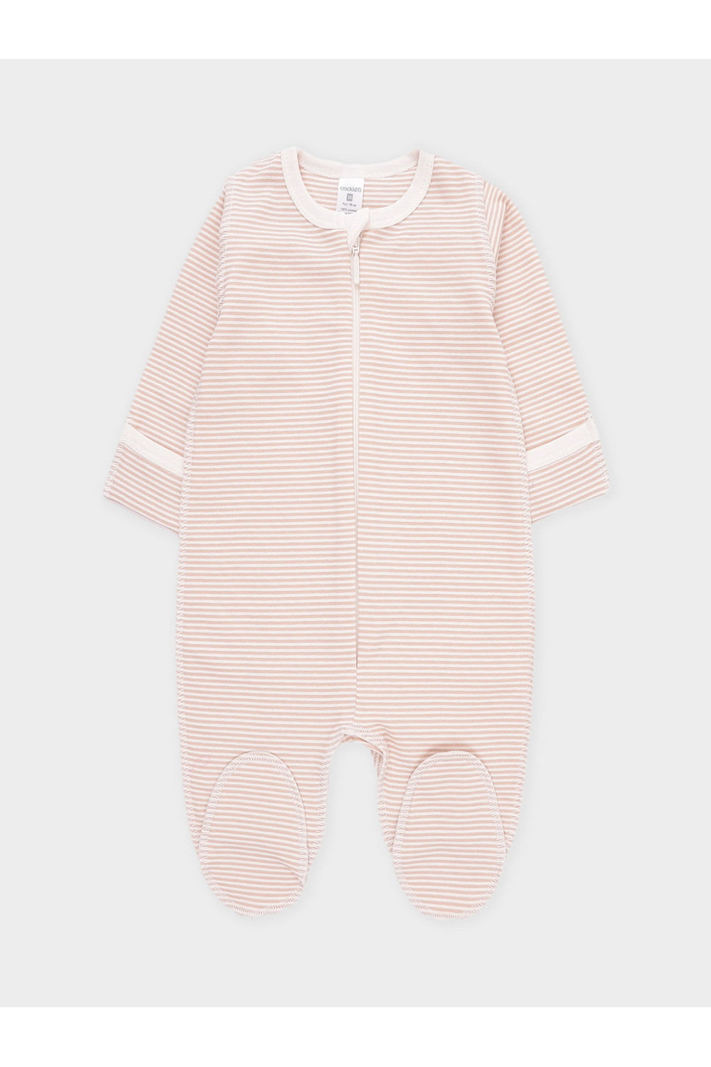 Комбинезон для новорождённых из тонкого футера с начёсом, произведённого из натурального хлопка. Застёгивается спереди на молнию с мягкой защитой шеи и подбородка. Оригинальная набивка выполнена из стойких гипоаллергенных текстильных красителей. Все трикотажные полотна производятся в соответствии с нормами швейцарского сертификата ЭкоТекс.