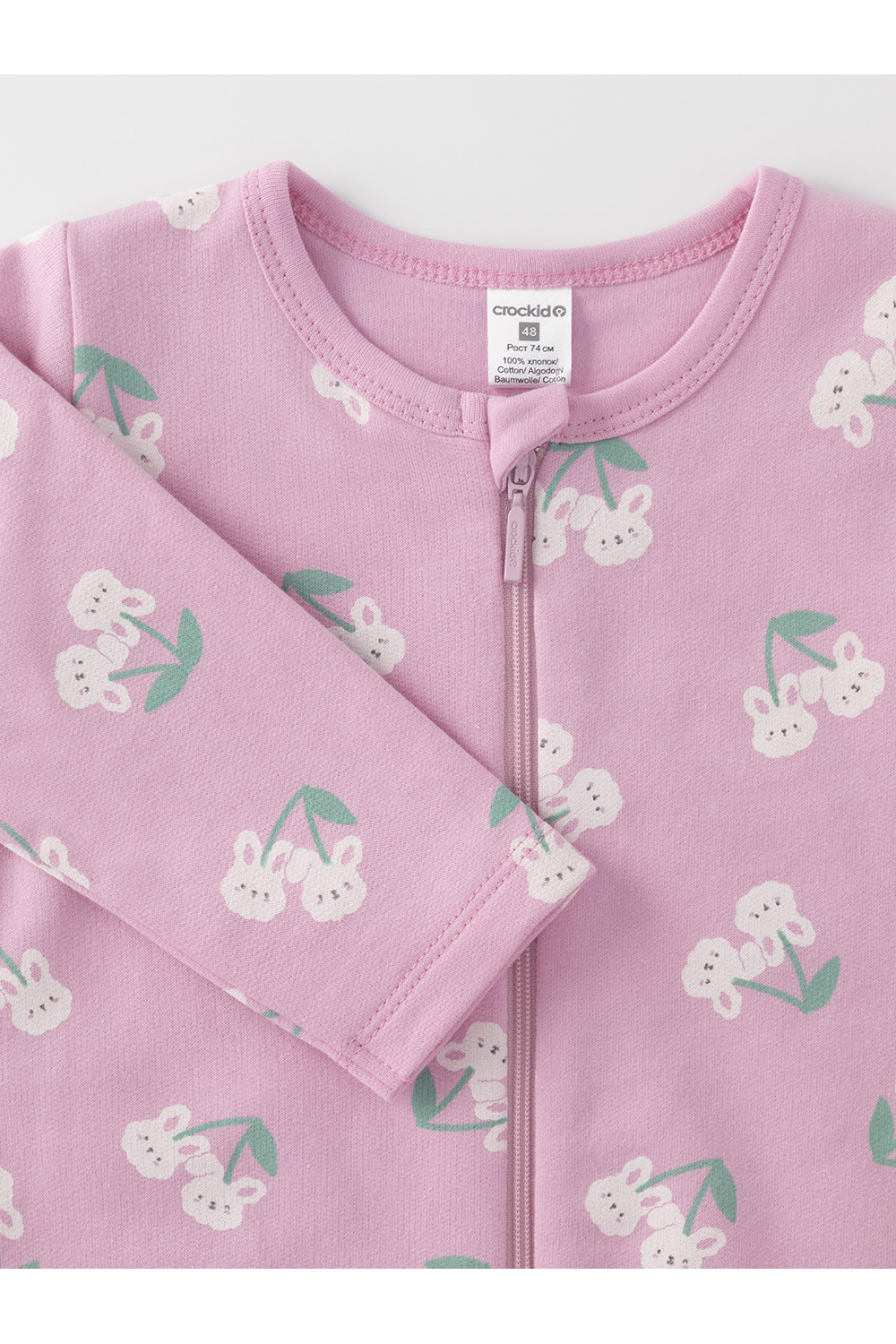 Комбинезон для новорождённых из тонкого футера с начёсом, произведённого из натурального хлопка. Застёгивается спереди на молнию с мягкой защитой шеи и подбородка. Оригинальная набивка выполнена из стойких гипоаллергенных текстильных красителей. Все трикотажные полотна производятся в соответствии с нормами швейцарского сертификата ЭкоТекс.