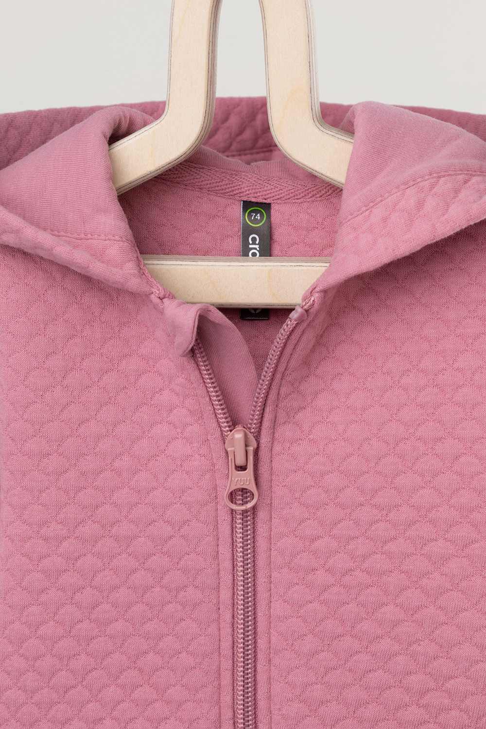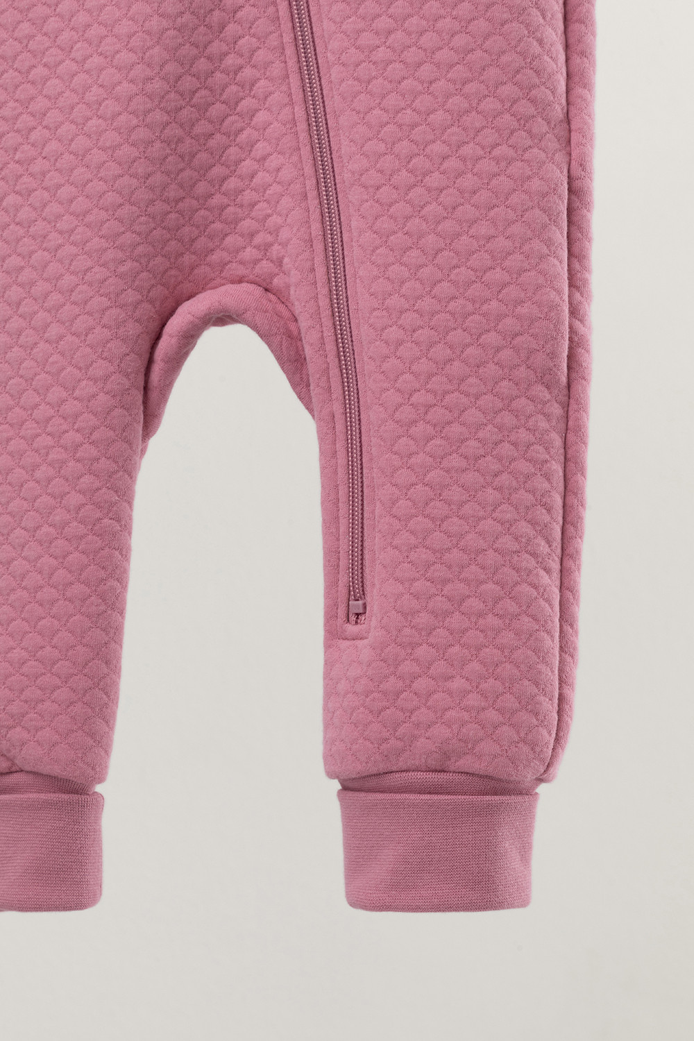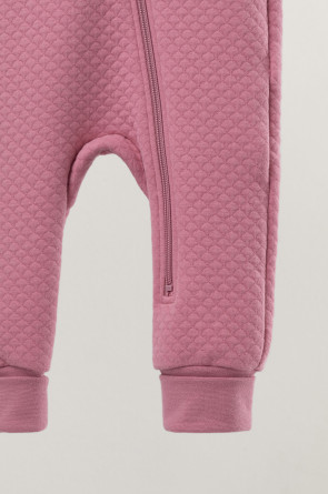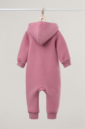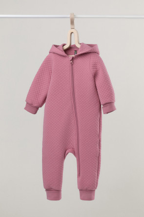 Тёплый комбинезон из капитония для новорождённых. Капитоний – это стёганое трикотажное полотно с утеплителем из полиэстеровой нити. Изделие застёгивается на молнию и имеет капюшон с подкладом из супрема. На рукавах и ножках эластичные манжеты из рибаны. Все трикотажные полотна производятся в соответствии с нормами Швейцарского сертификата ЭкоТекс.