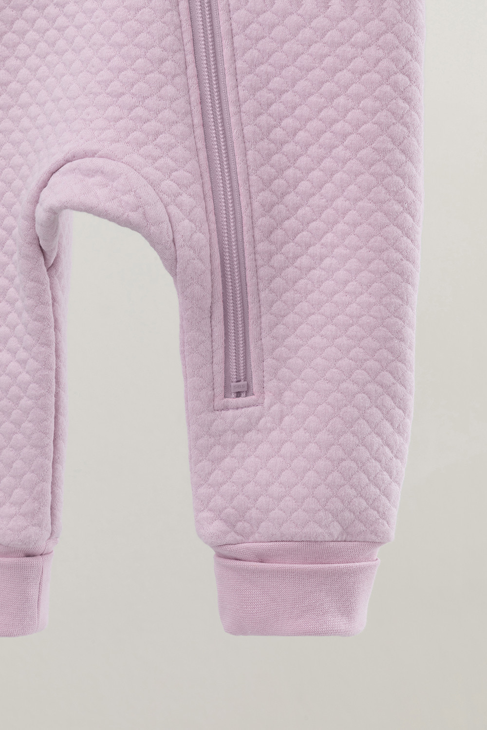 Тёплый комбинезон из капитония для новорождённых. Капитоний – это стёганое трикотажное полотно с утеплителем из полиэстеровой нити. Изделие застёгивается на молнию и имеет капюшон с подкладом из супрема. На рукавах и ножках эластичные манжеты из рибаны. Все трикотажные полотна производятся в соответствии с нормами Швейцарского сертификата ЭкоТекс.