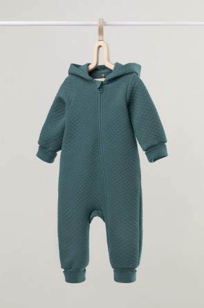 Тёплый комбинезон из капитония для новорождённых. Капитоний – это стёганое трикотажное полотно с утеплителем из полиэстеровой нити. Изделие застёгивается на молнию и имеет капюшон с подкладом из супрема. На рукавах и ножках эластичные манжеты из рибаны. Все трикотажные полотна производятся в соответствии с нормами Швейцарского сертификата ЭкоТекс.