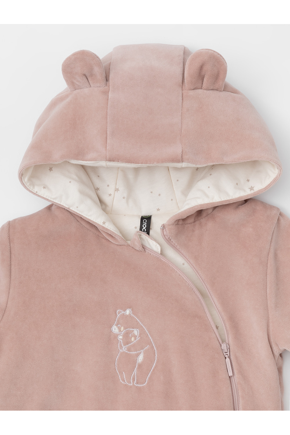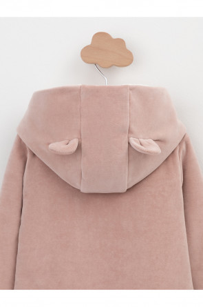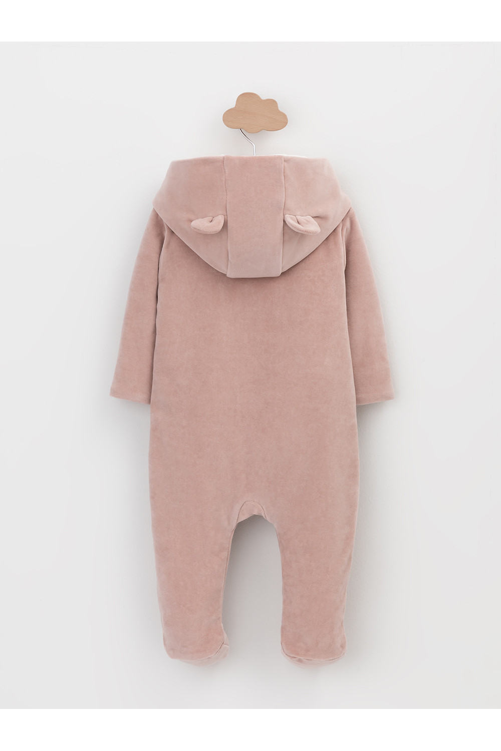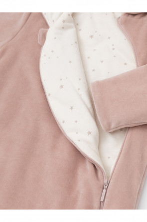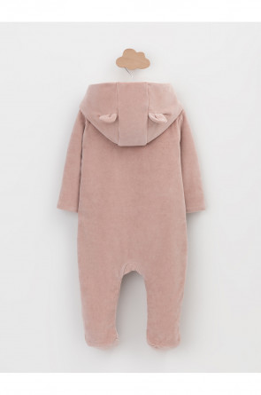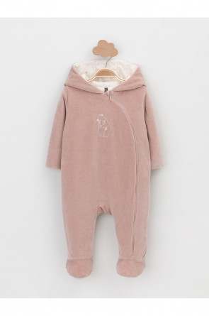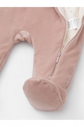 Тёплый комбинезон из велюра для новорождённых. Внутри синтепон и подклад из натурального хлопка. Изделие застёгивается на молнию и имеет капюшон. В размерах 80 и 86 на ножках манжеты. Все трикотажные полотна производятся в соответствии с нормами Швейцарского сертификата ЭкоТекс.